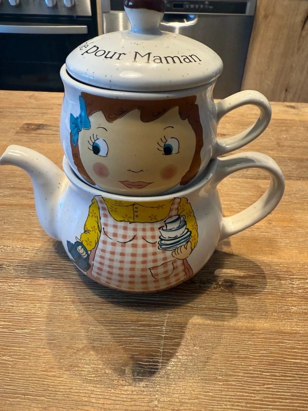 Selling a sweet vintage teapot and mug set! It features a cute girl design and the words 'Pour Maman' on the lid. Perfect for a cozy cuppa!