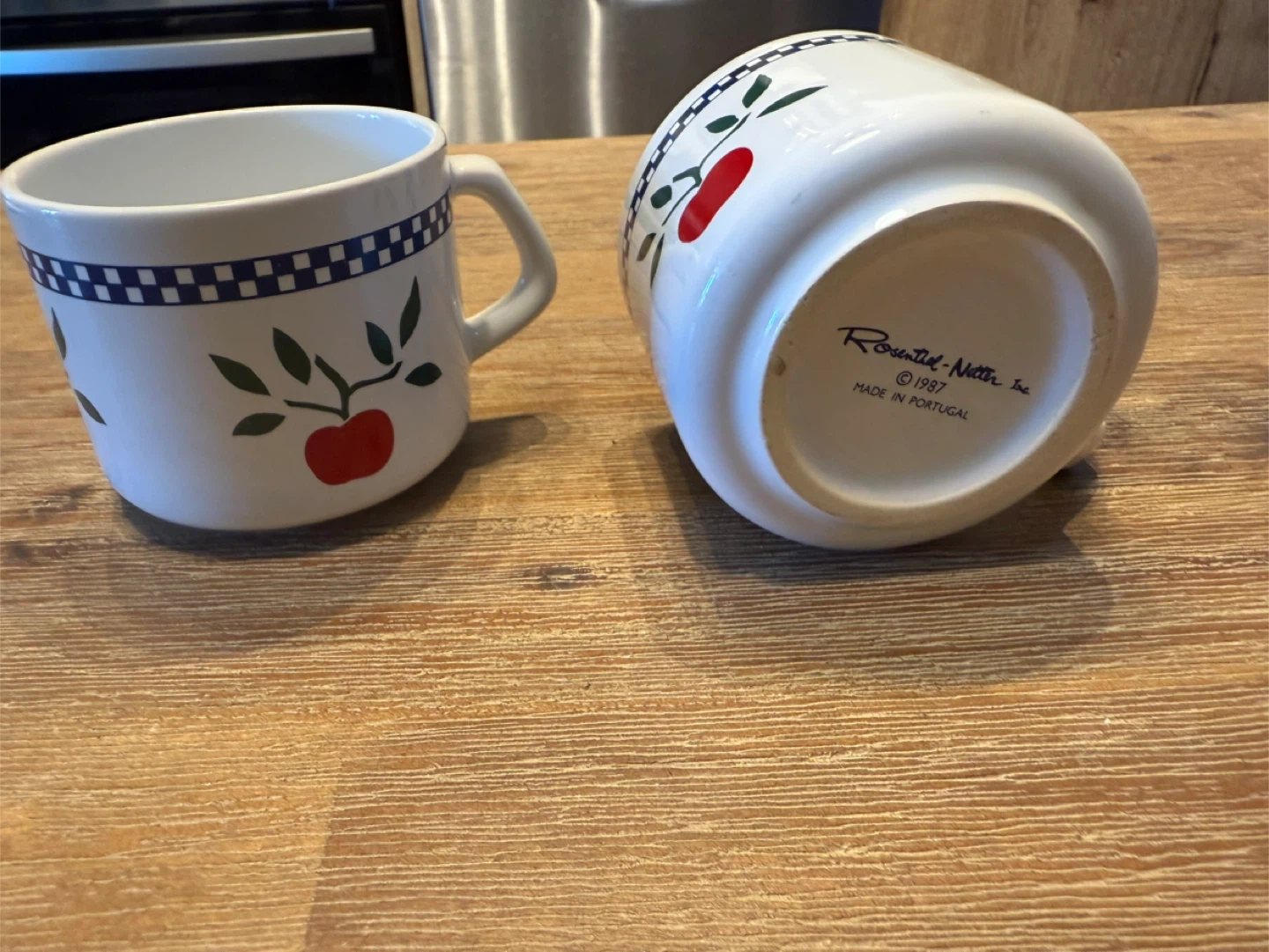 Selling a set of two Rosenthal-Netter Inc. mugs. These mugs are decorated with a cute apple design and a blue checkered pattern. They were made in Portugal in 1987. Perfect for adding a touch of vintage charm to your kitchen!
