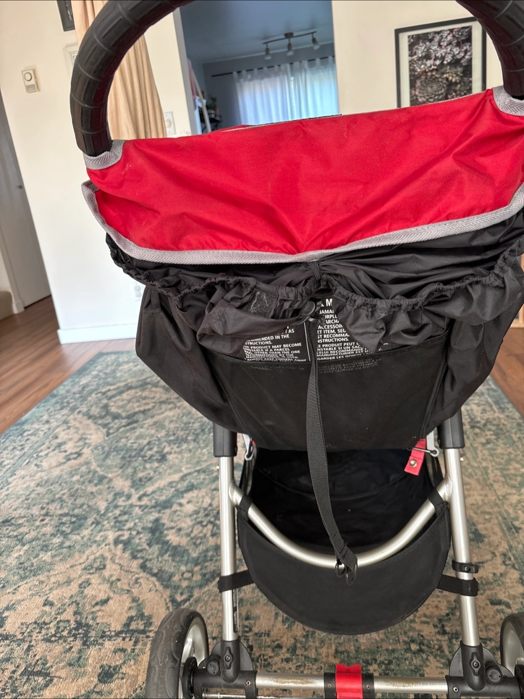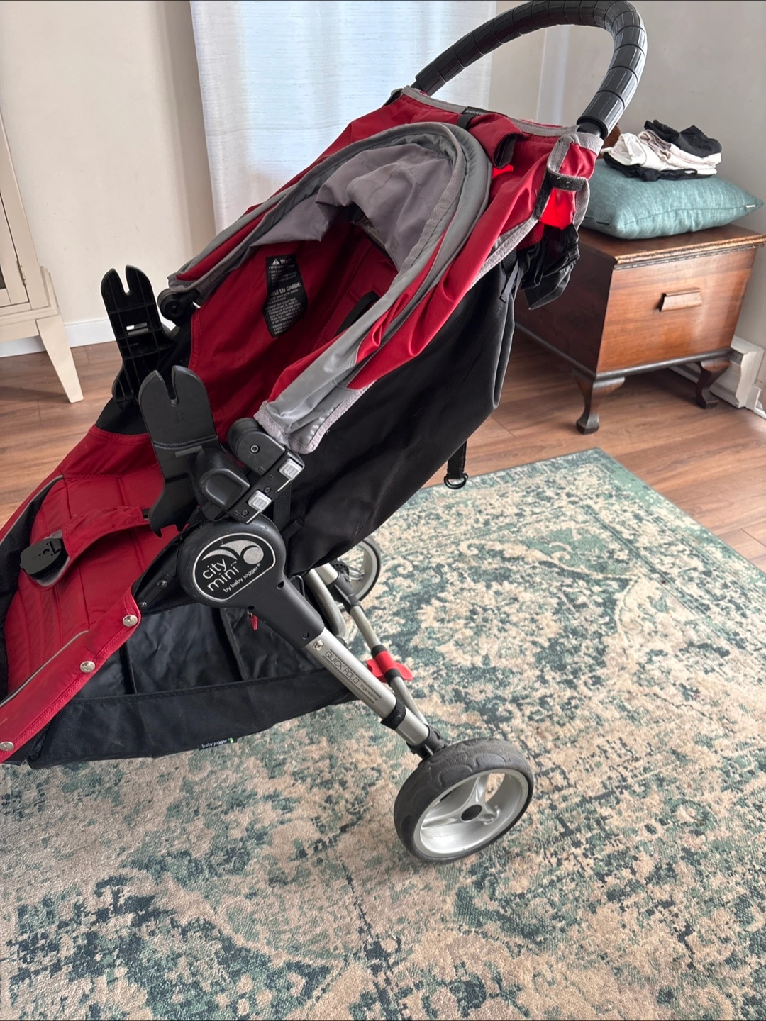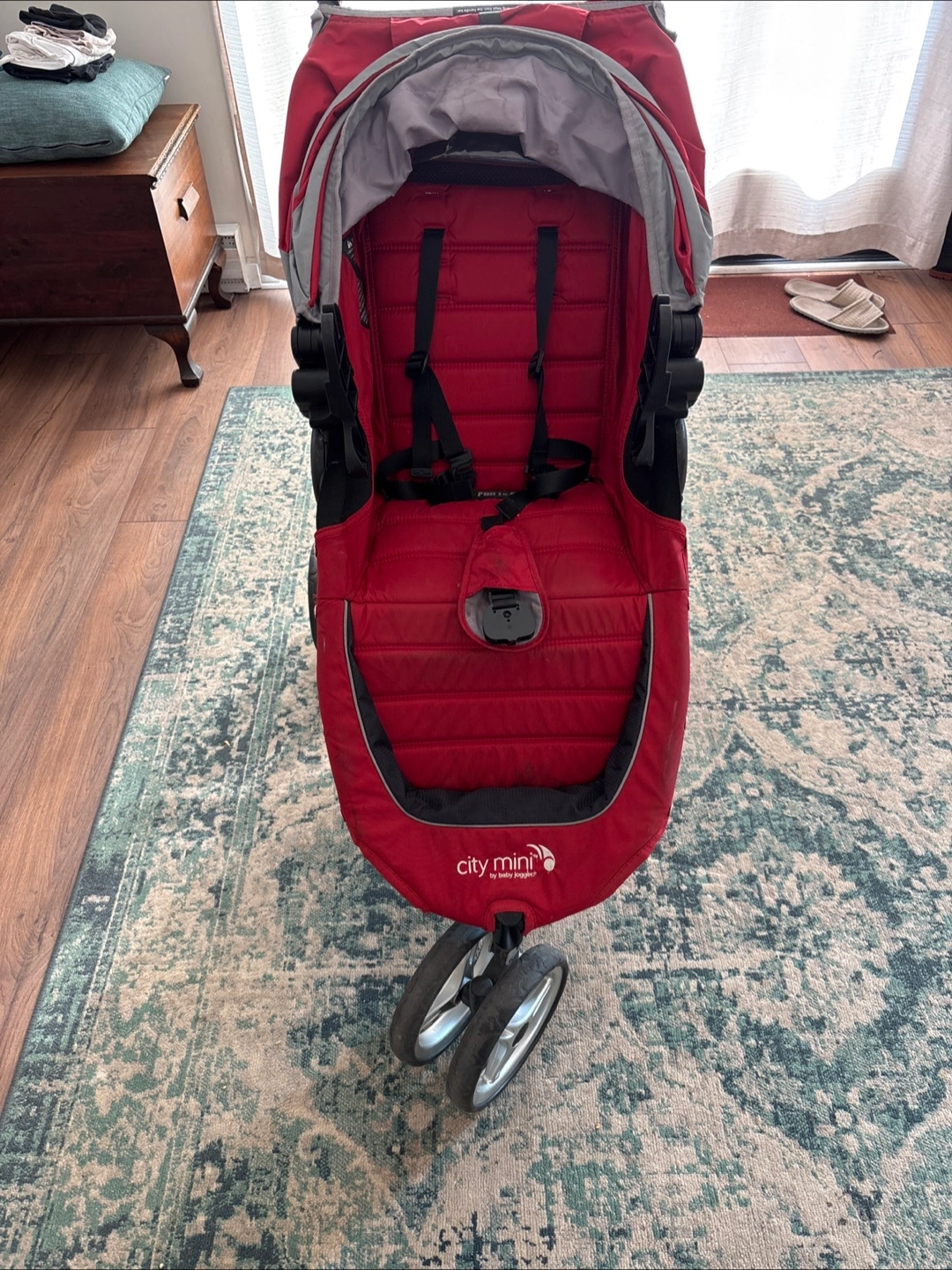 Selling a Baby Jogger City Mini stroller in red. It's in good condition and ready for a new home. Perfect for walks around the neighbourhood!