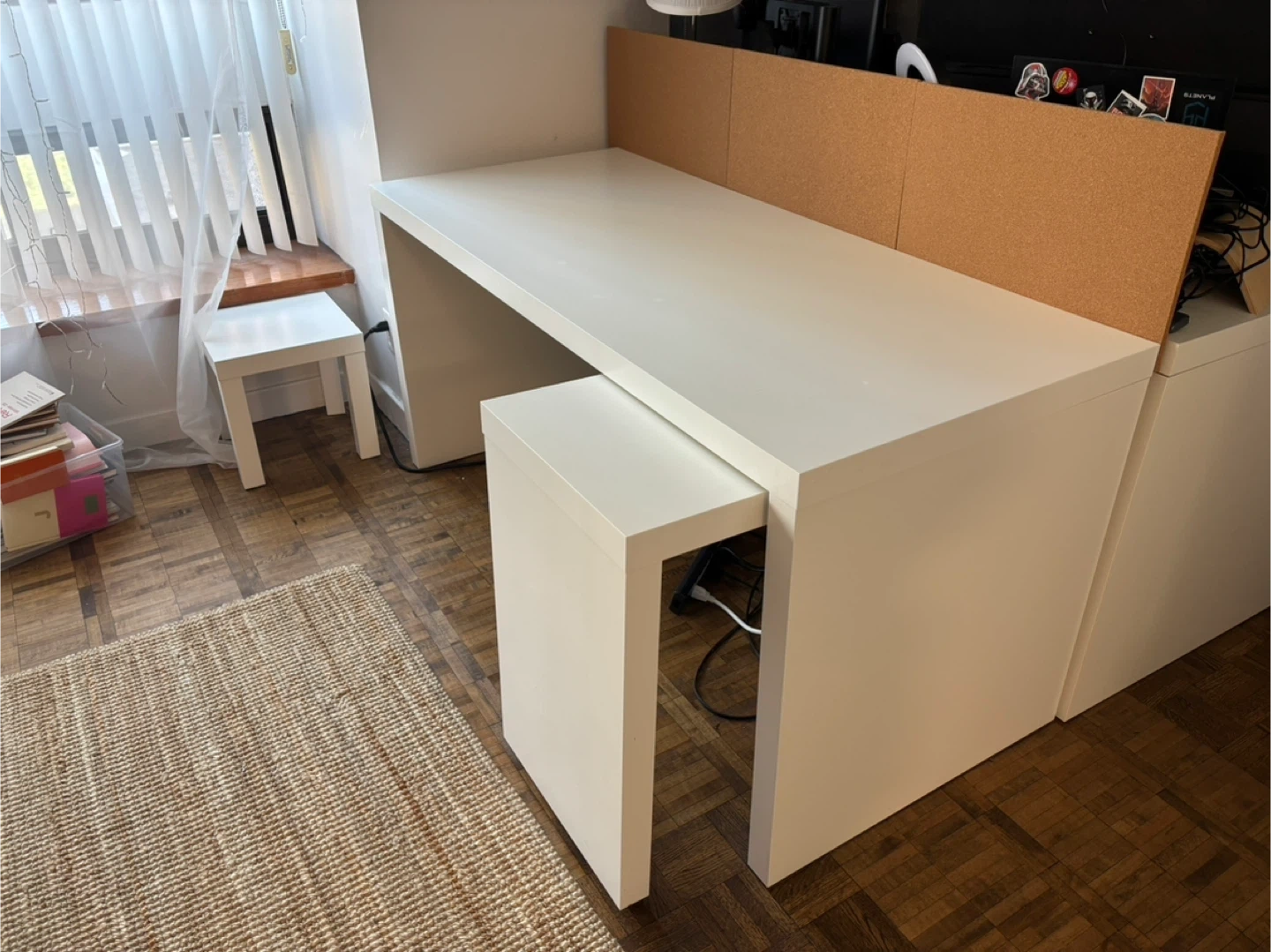 Selling a white desk with a corkboard backing. It's in great condition and would be perfect for a home office or study space. The desk has a minimalist design and provides ample workspace. The corkboard is great for pinning notes and reminders! Small screw hole on the back left corner of the desk, because I had a paper roll attached onto it. You have the option to have it as an L shape or not.