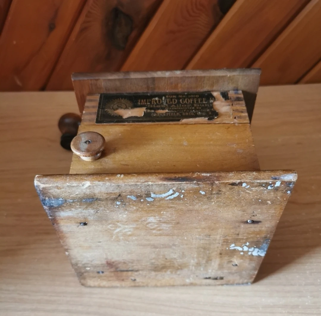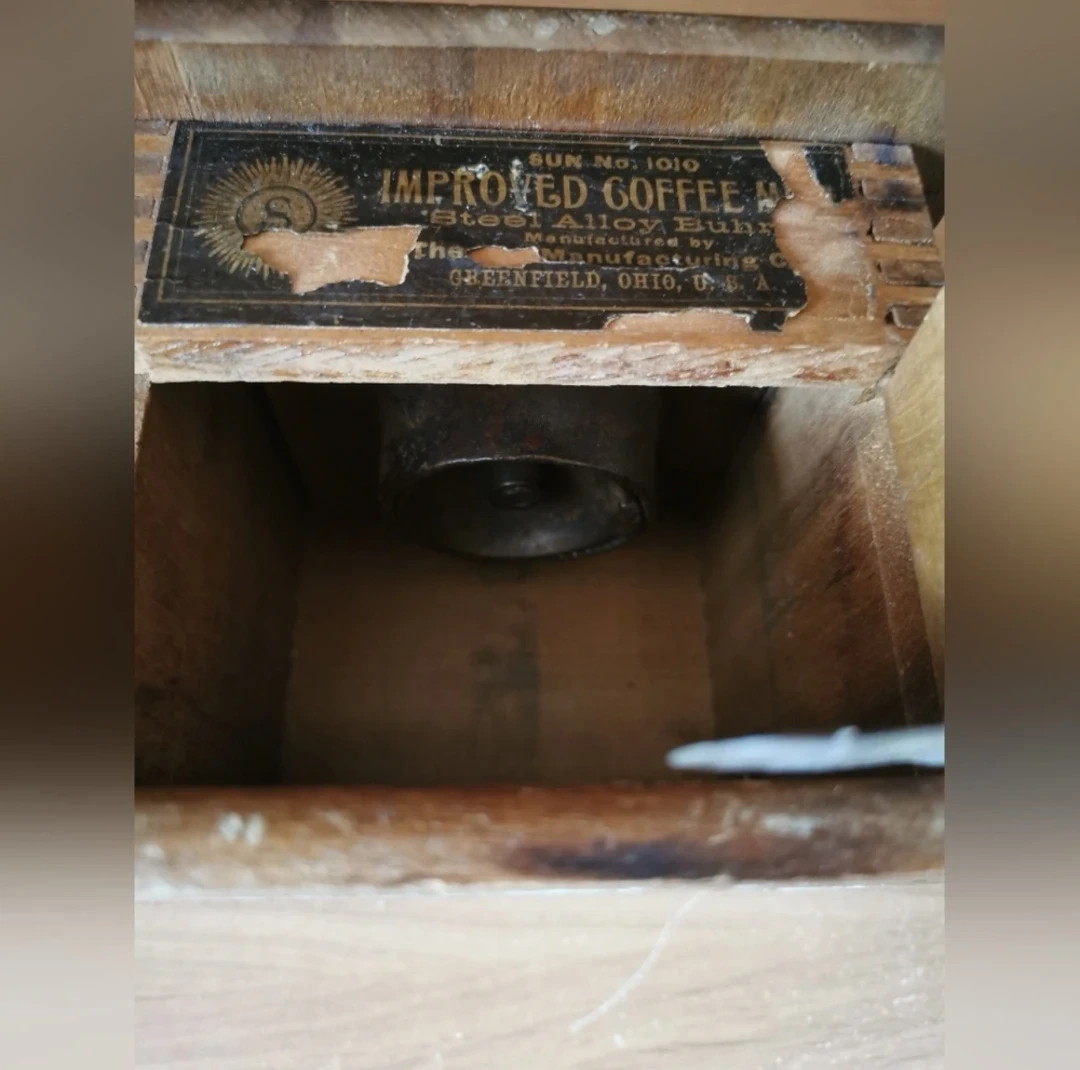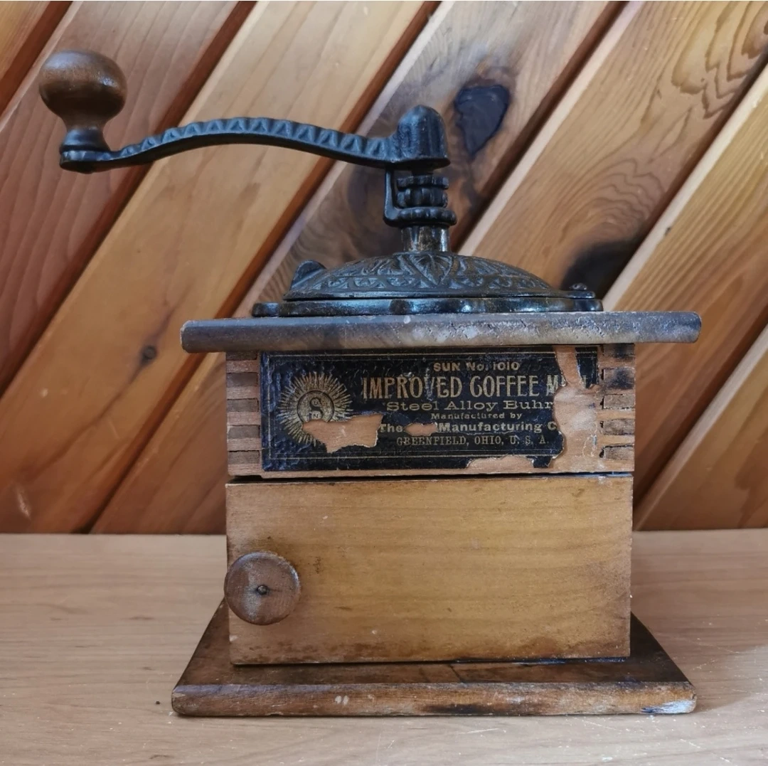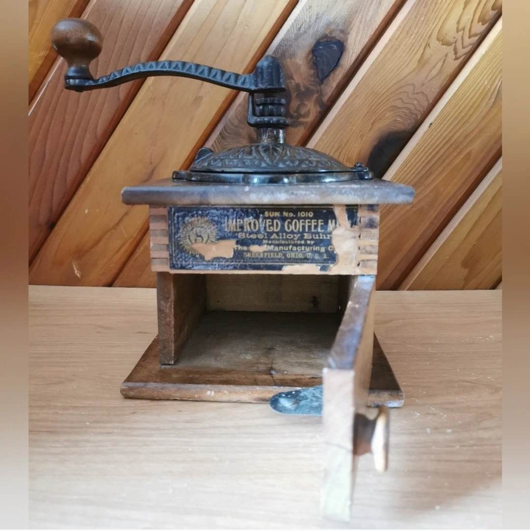 Antique 1800’s Sun Manufacturing Co. No. 1010 Improved Coffee Grinder With A Drawer. Made of Cast Iron and Wood, in great vintage condition, about 4 inch tall, 6 inch wide, made in USA