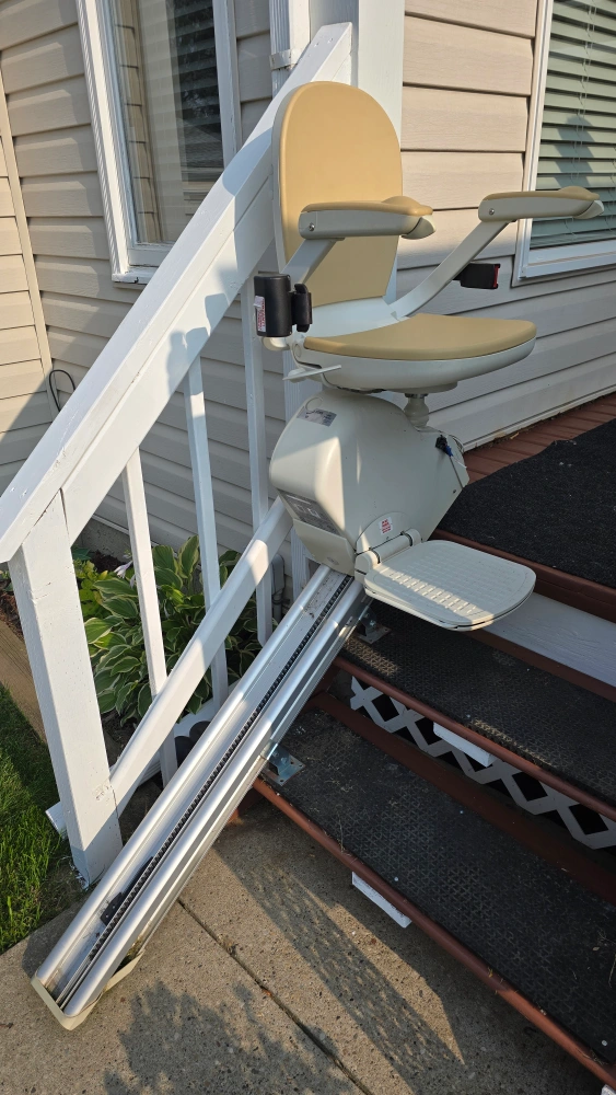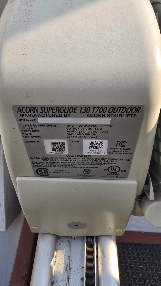 Selling an Acorn Superglide 130 T700 Outdoor Stairlift. It's designed for outdoor use and can support up to 300lbs (127 kg). It comes with remote controls for easy operation.