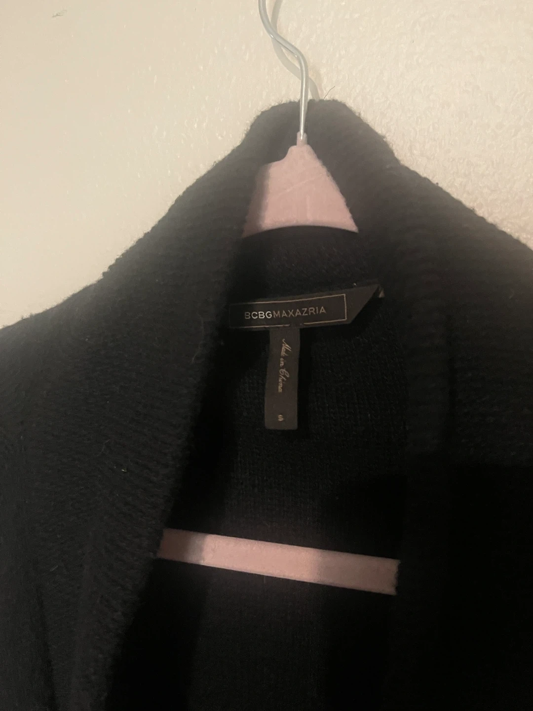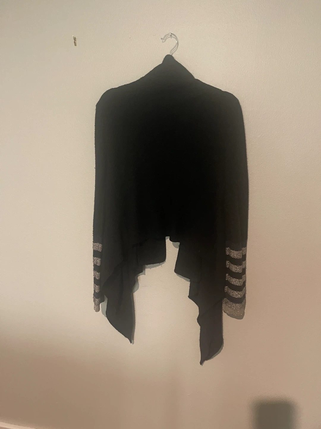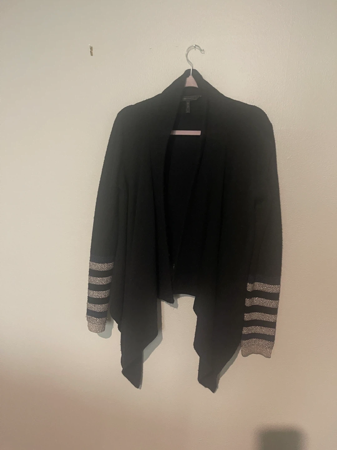 Cozy black cardigan from BCBGMAXAZRIA, size small. It features a stylish open-front design and unique silver stripe detailing on the sleeves. Perfect for layering!