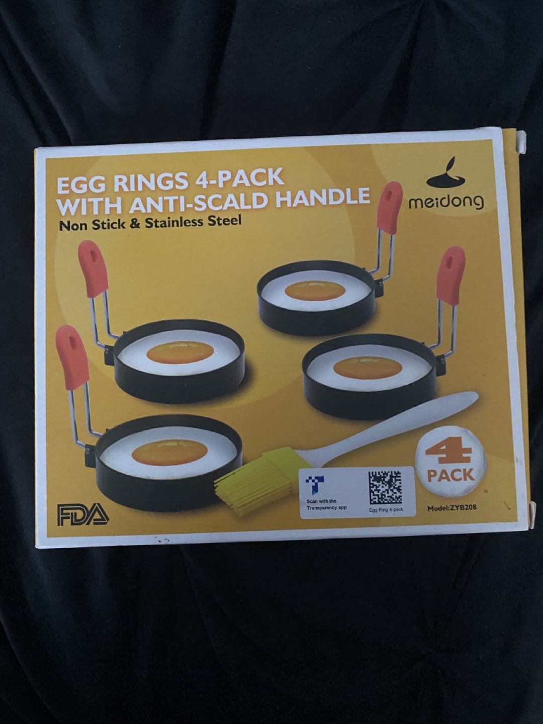 Giving away a brand new set of Meidong egg rings, still in the box! This is a 4-pack set with anti-scald handles. They're made of non-stick stainless steel, so cleanup is a breeze. Model number is ZYB208