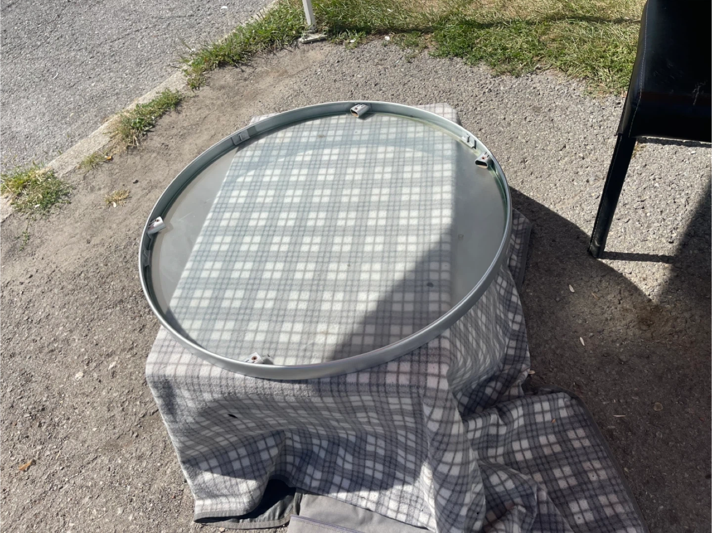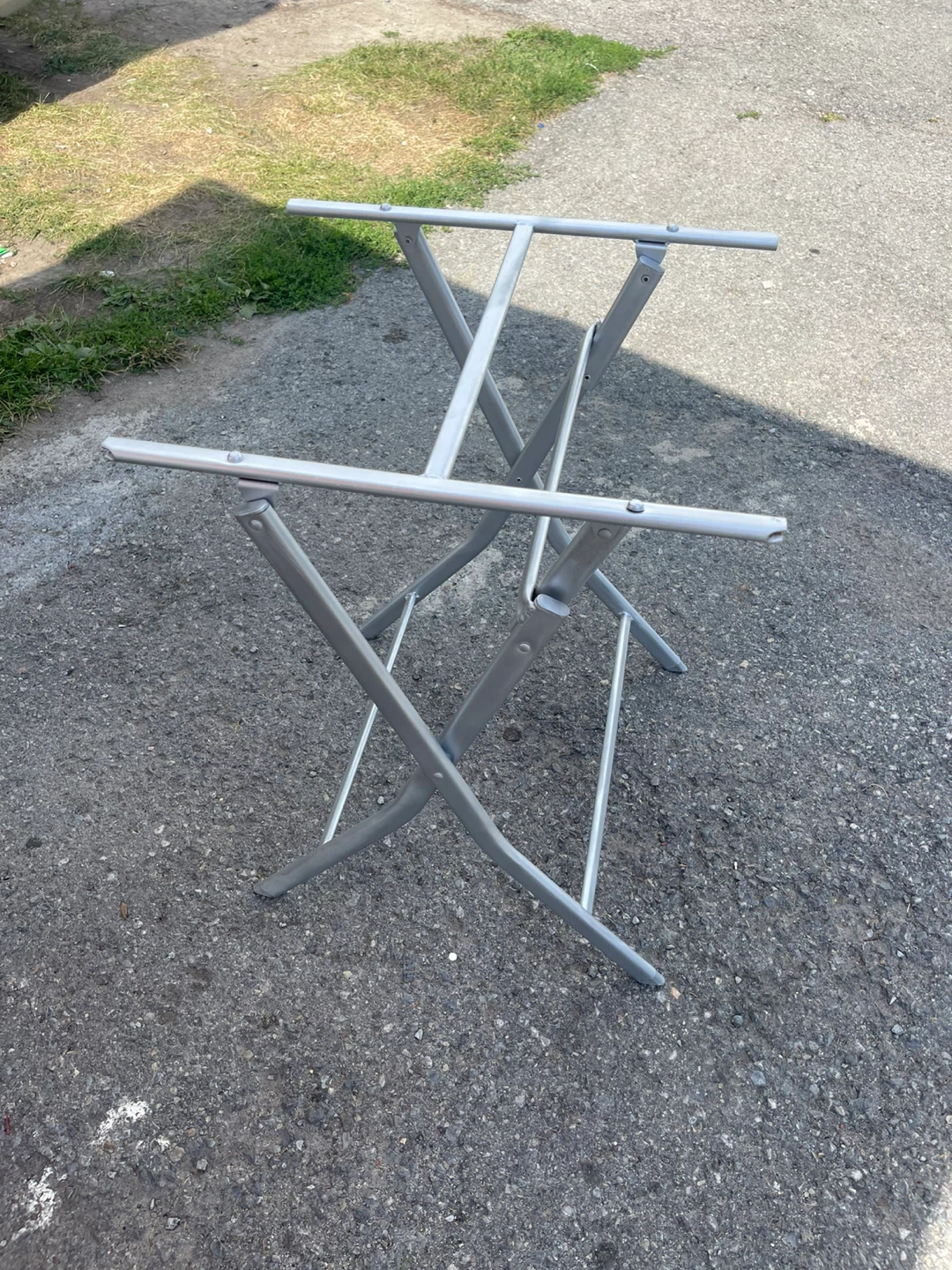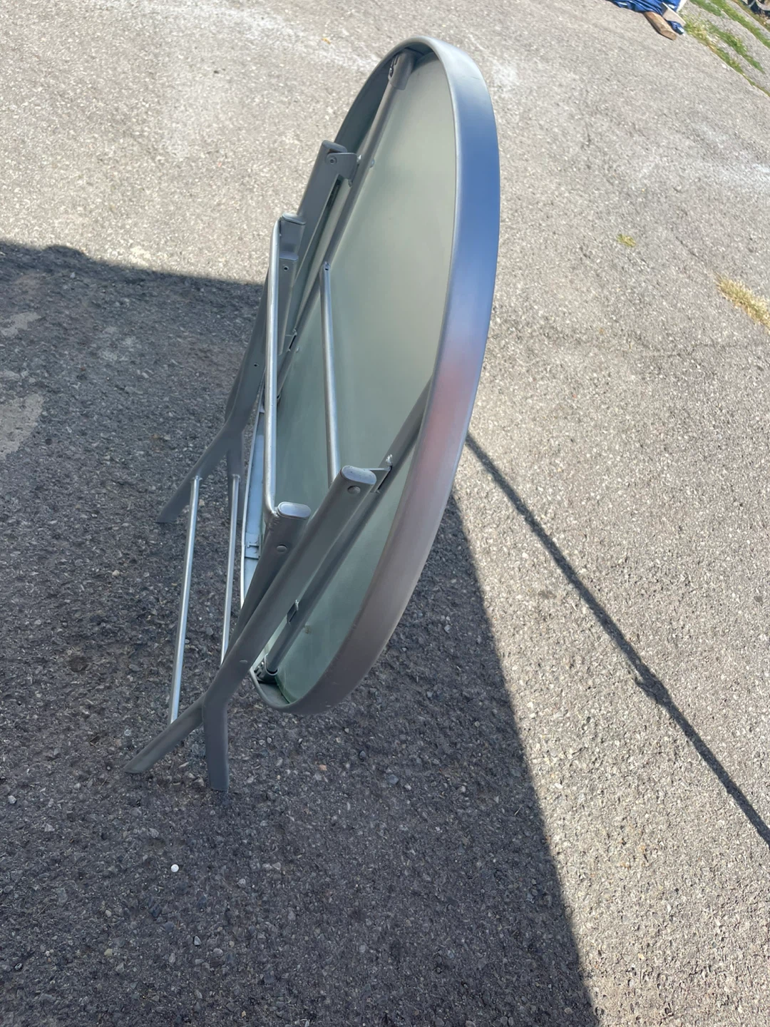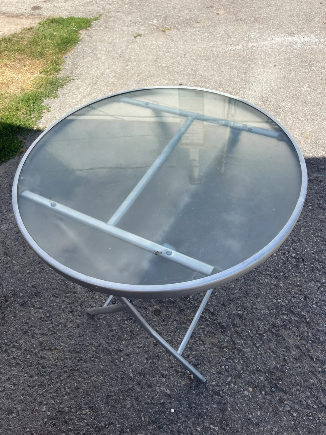 Selling a round folding table with a glass top and silver frame. It's perfect for small spaces and easy to store when not in use. The table is in good condition and ready for a new home!new paint