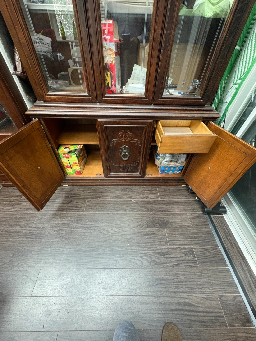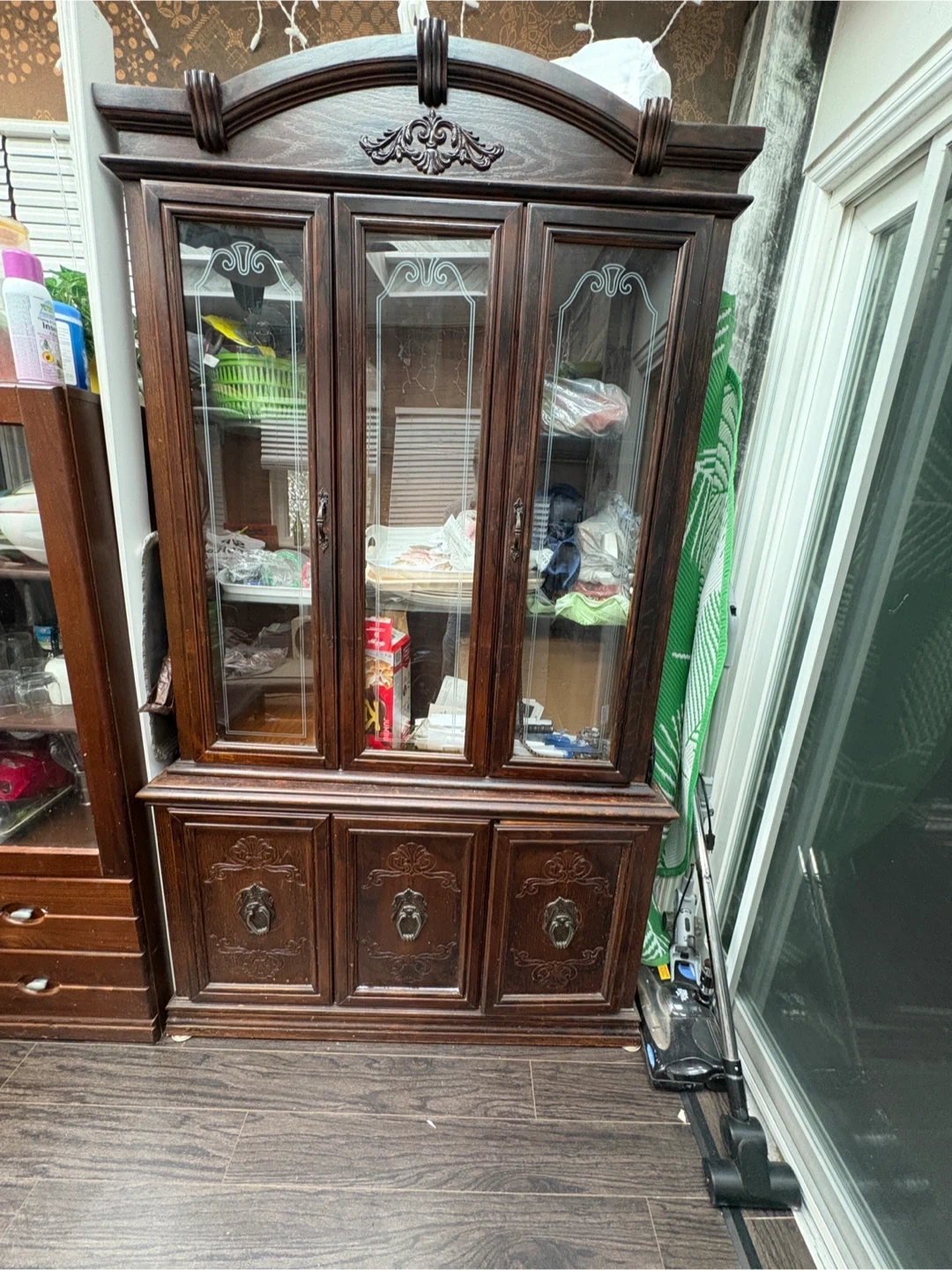 Selling a vintage wooden china cabinet. It features glass doors on the upper section and wooden doors with drawers on the lower section. It's perfect for displaying your fine china or storing other household items. The cabinet is in good condition and ready for a new home!