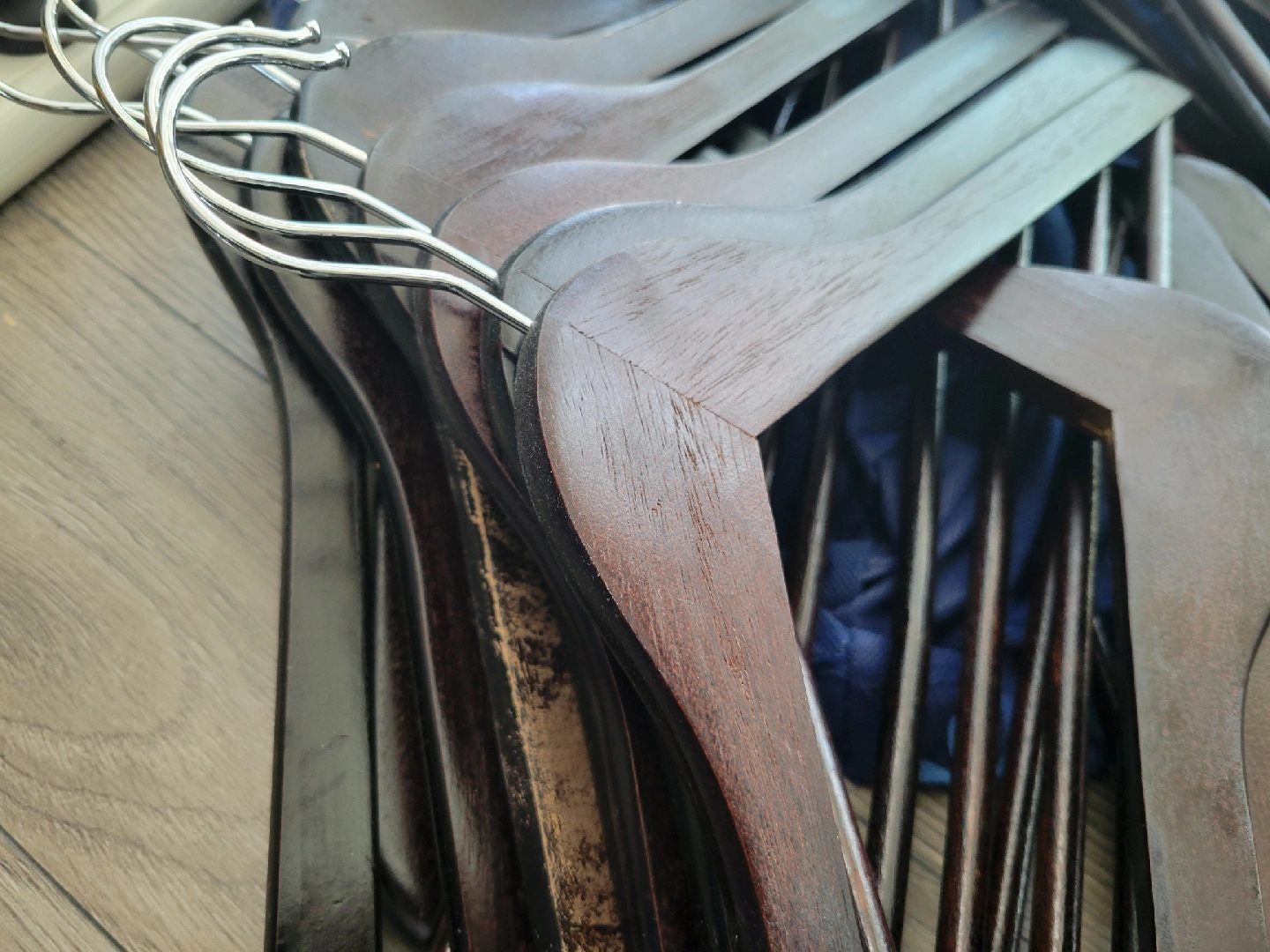 Selling a set of wooden clothes hangers! They're in great condition and perfect for keeping your closet organized and looking neat.