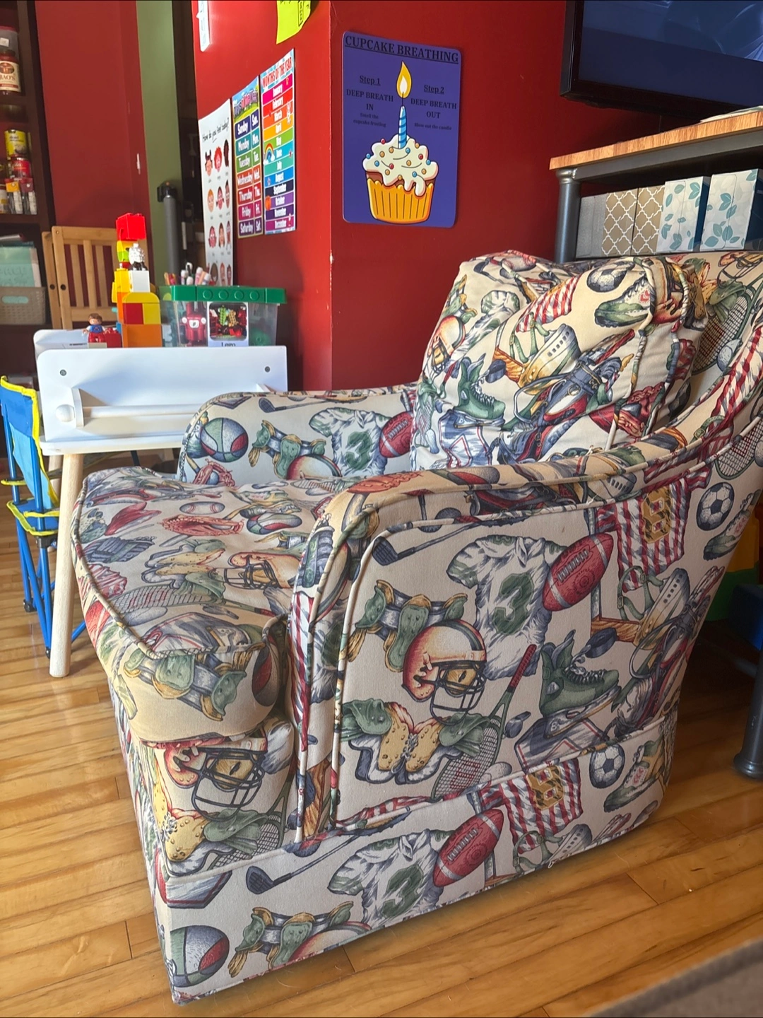 Comfortable armchair with a fun sports-themed pattern, perfect for a cozy reading nook or to add a pop of personality to any room! It's in great condition and ready for a new home