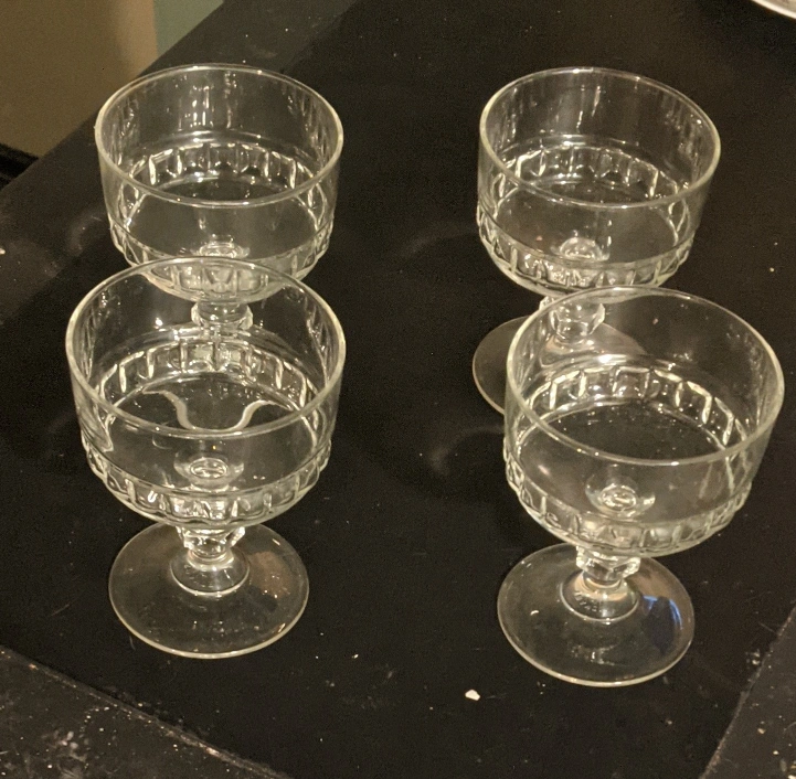 Selling a set of four clear dessert glasses! They're in great shape and ready for your favourite treats like mousse or pudding