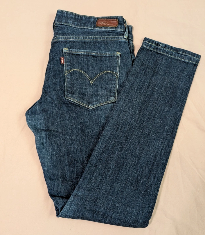 Selling a pair of Levi's Demi Curve skinny jeans in size 28. They're in great condition and ready for a new home! The jeans are a classic dark wash, perfect for any occasion. They are a skinny style and feature the iconic Levi's back pockets. Minor wear on inner thigh - see photo.