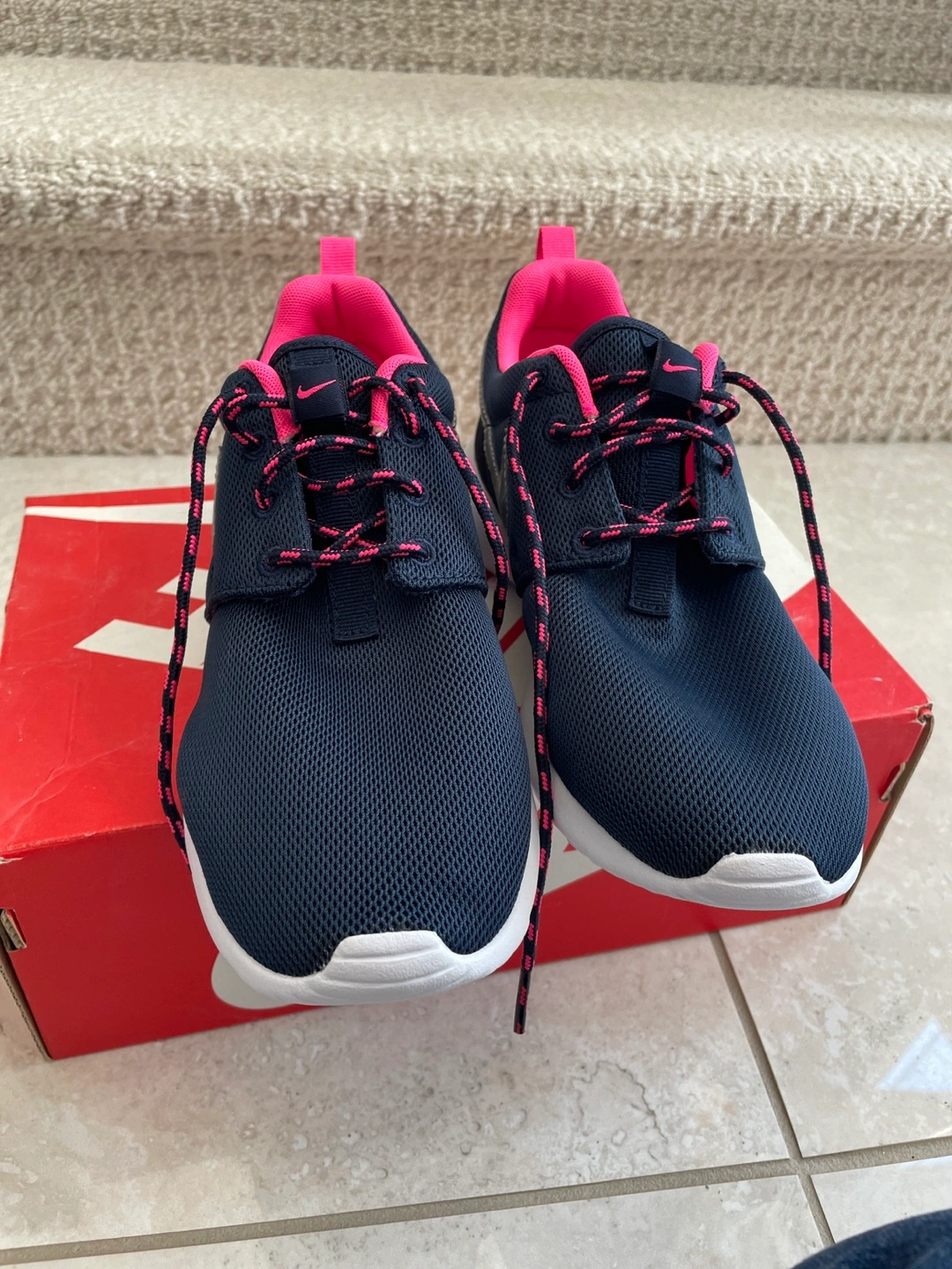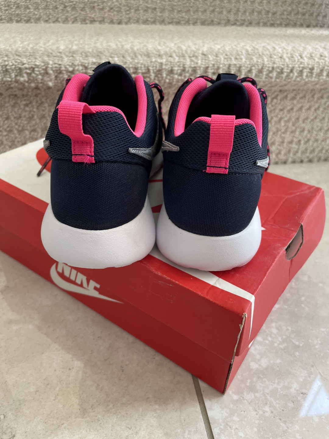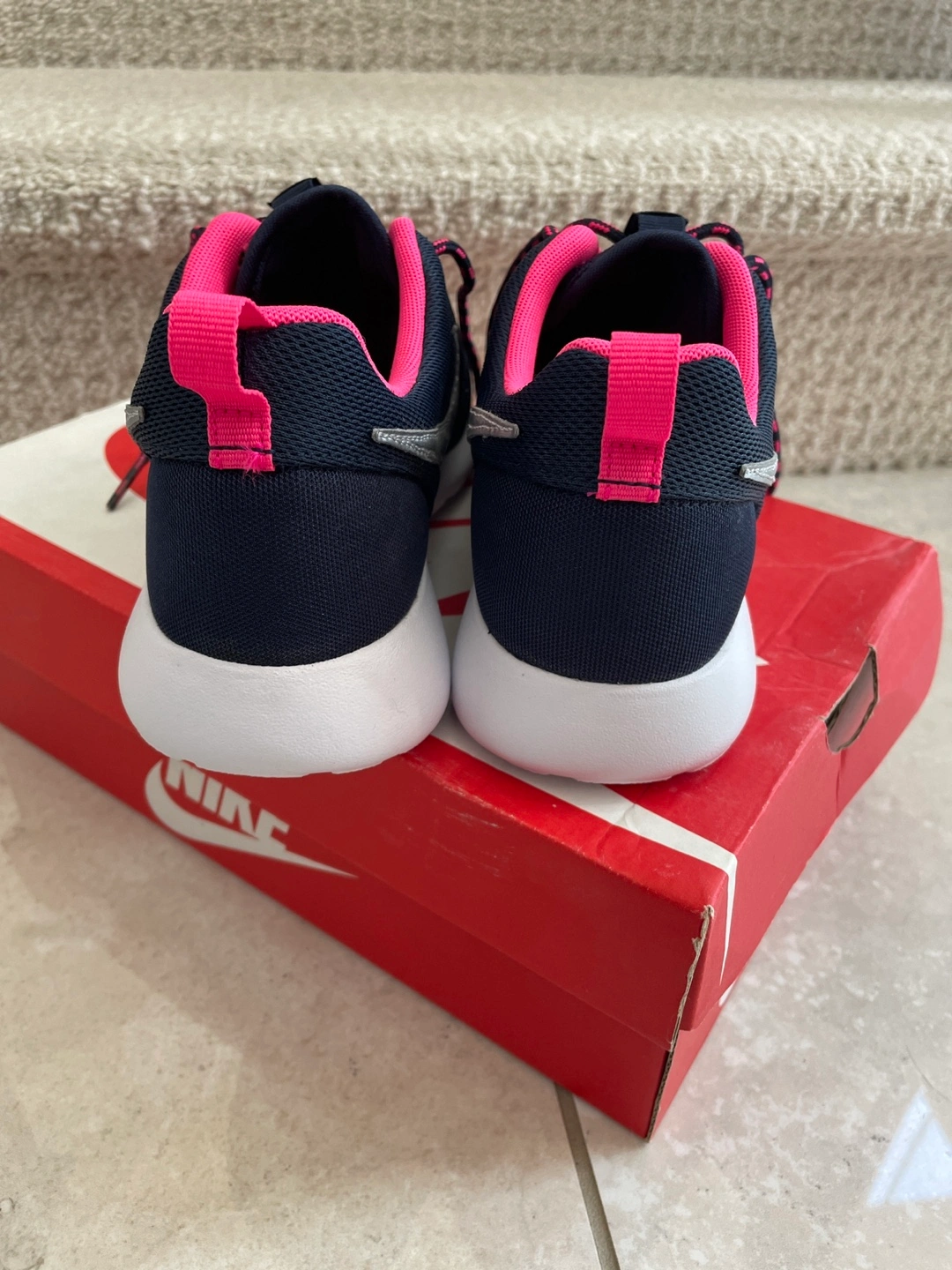 Selling a pair of girls' Nike Roshe One sneakers! They're a stylish navy blue with pink accents and a white sole. These are a size 4.5Y ready for a new home.