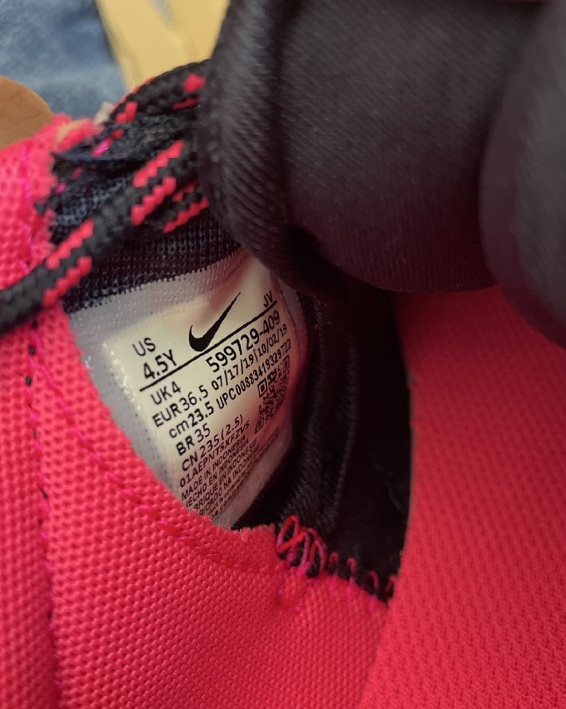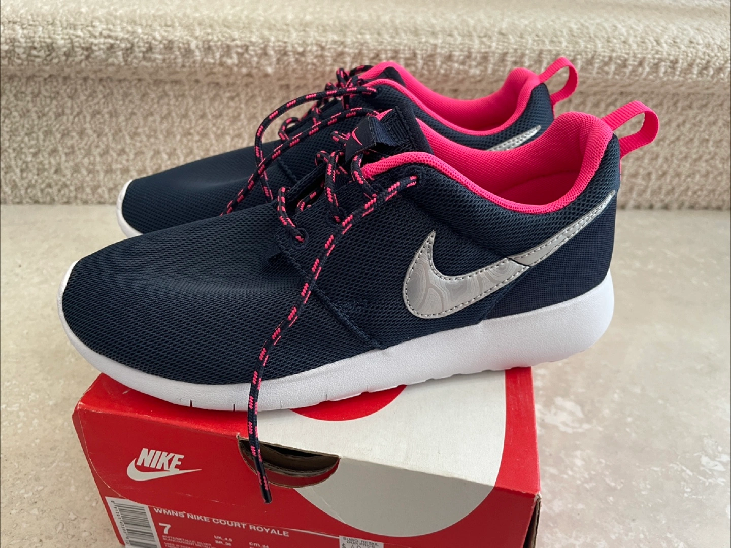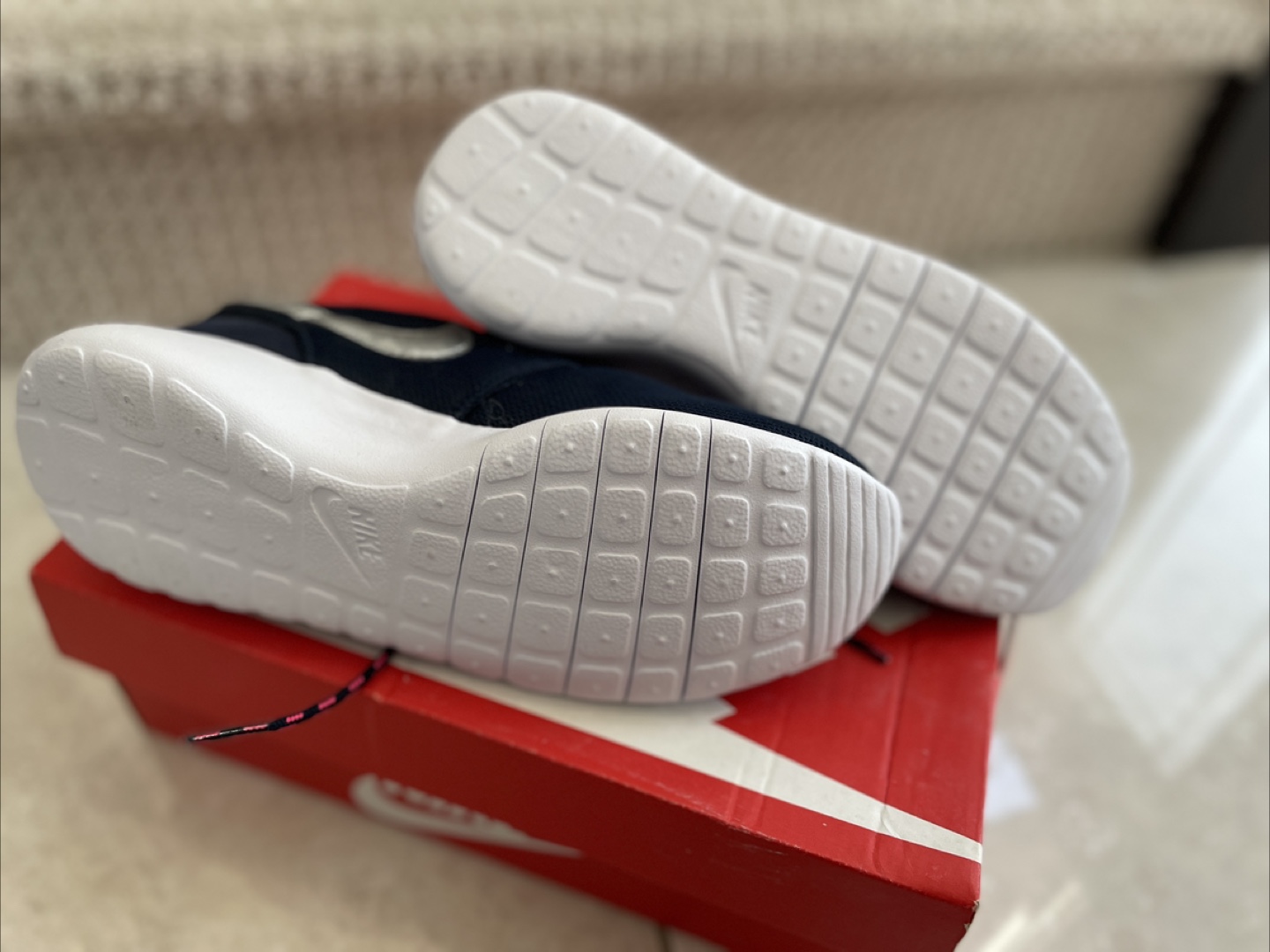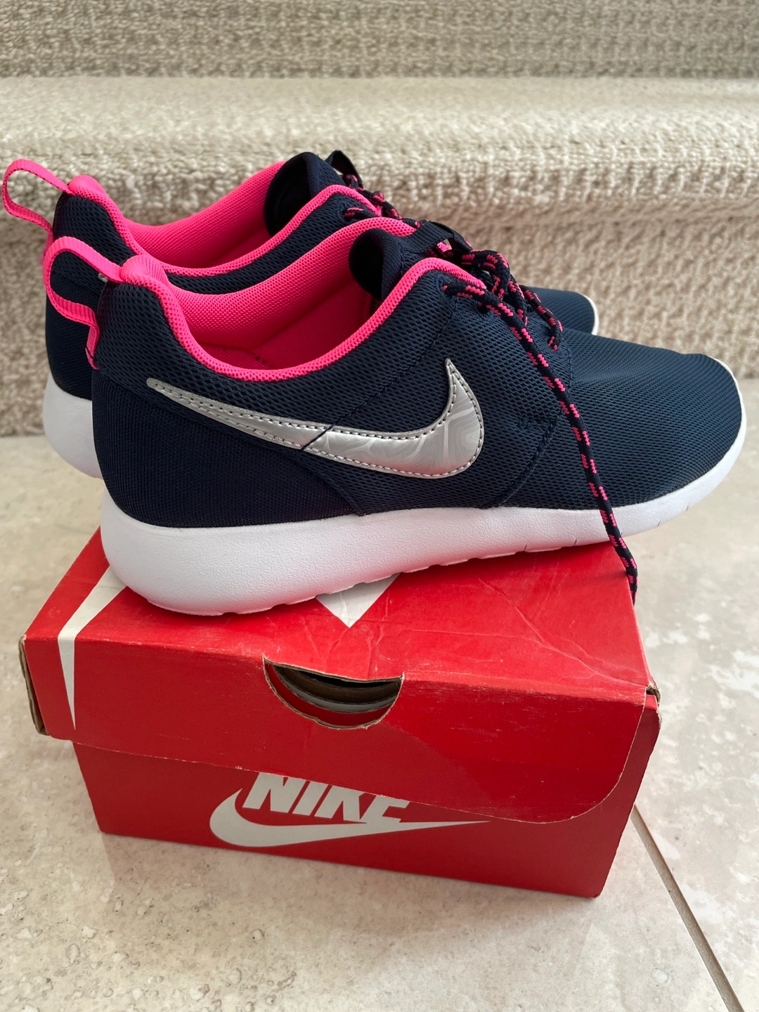 Selling a pair of girls' Nike Roshe One sneakers! They're a stylish navy blue with pink accents and a white sole. These are a size 4.5Y ready for a new home.