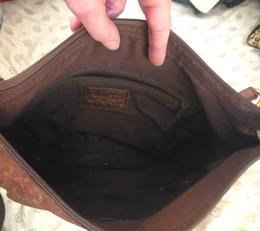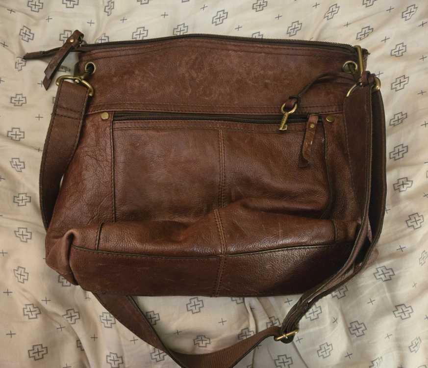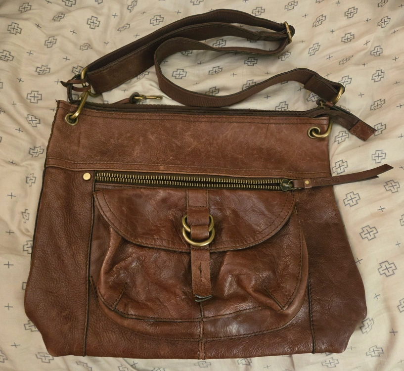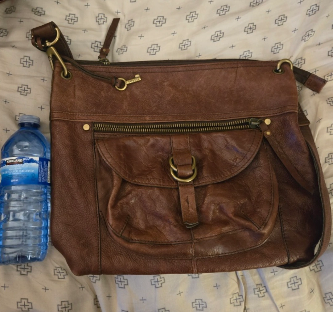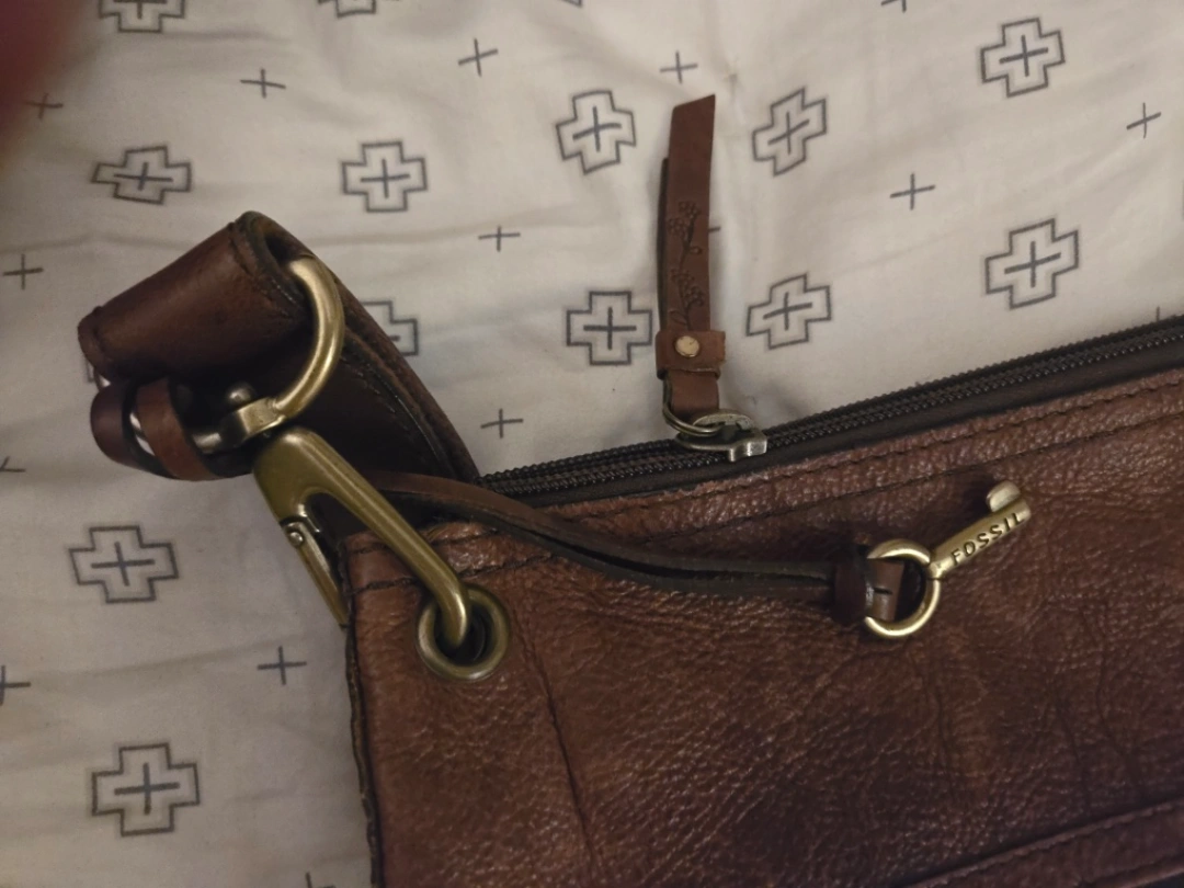 I'm selling a gently used Fossil crossbody bag. It's made of brown leather and has a front pocket with a buckle detail. The bag has some signs of wear, but is still in good condition for everyday use!