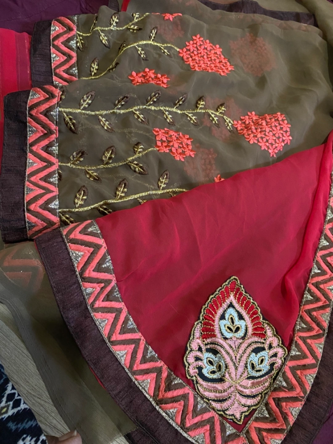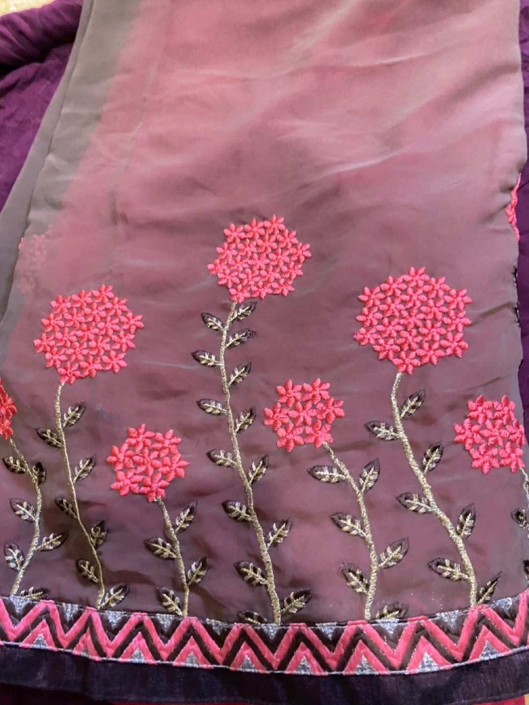Beautiful saree with floral embroidery and a decorative border. The fabric is lightweight and has a lovely drape. Perfect for special occasions!
