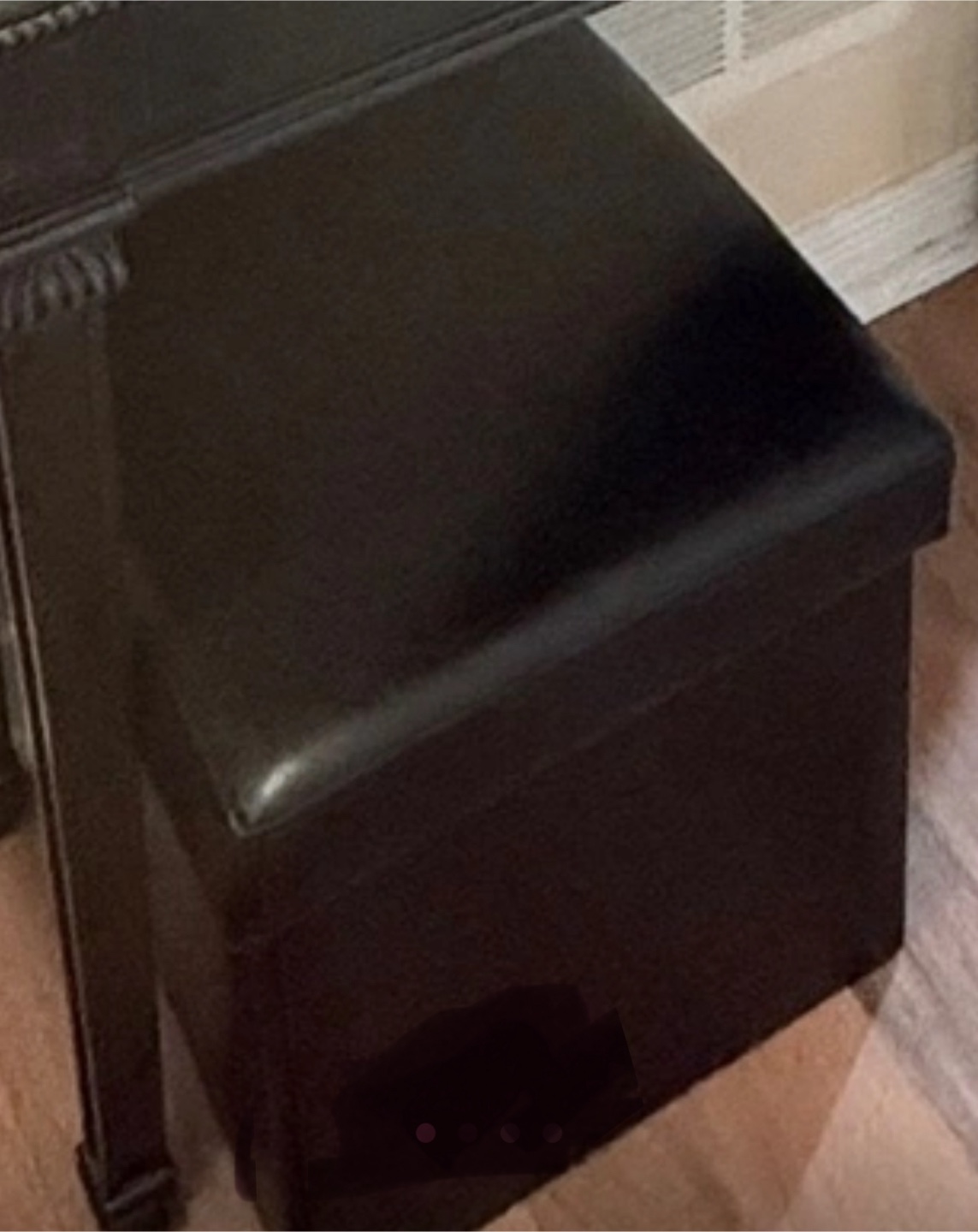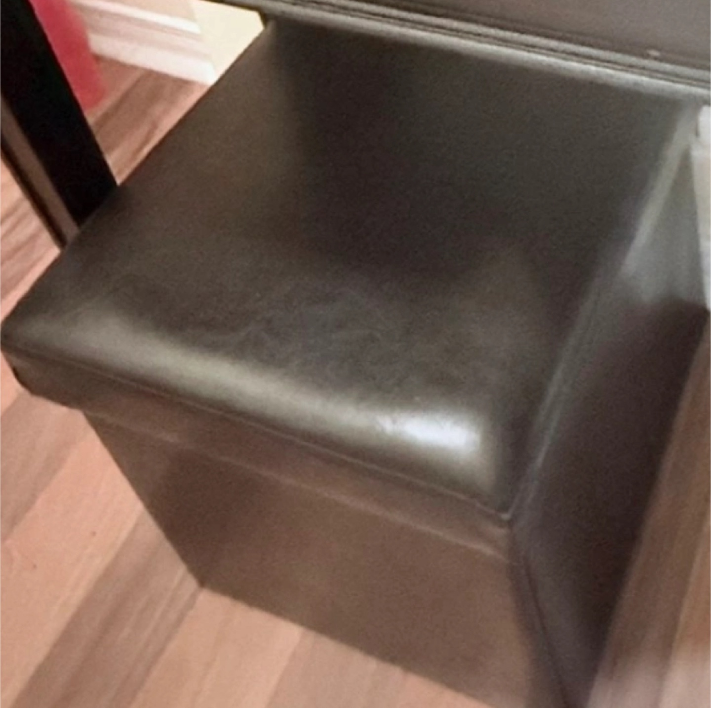 Here's a handy storage ottoman with a faux leather finish! It's perfect for storing items while providing extra seating or a place to rest your feet. It's in good condition and ready for a new home! Has a small rip at cover side but can’t notice.