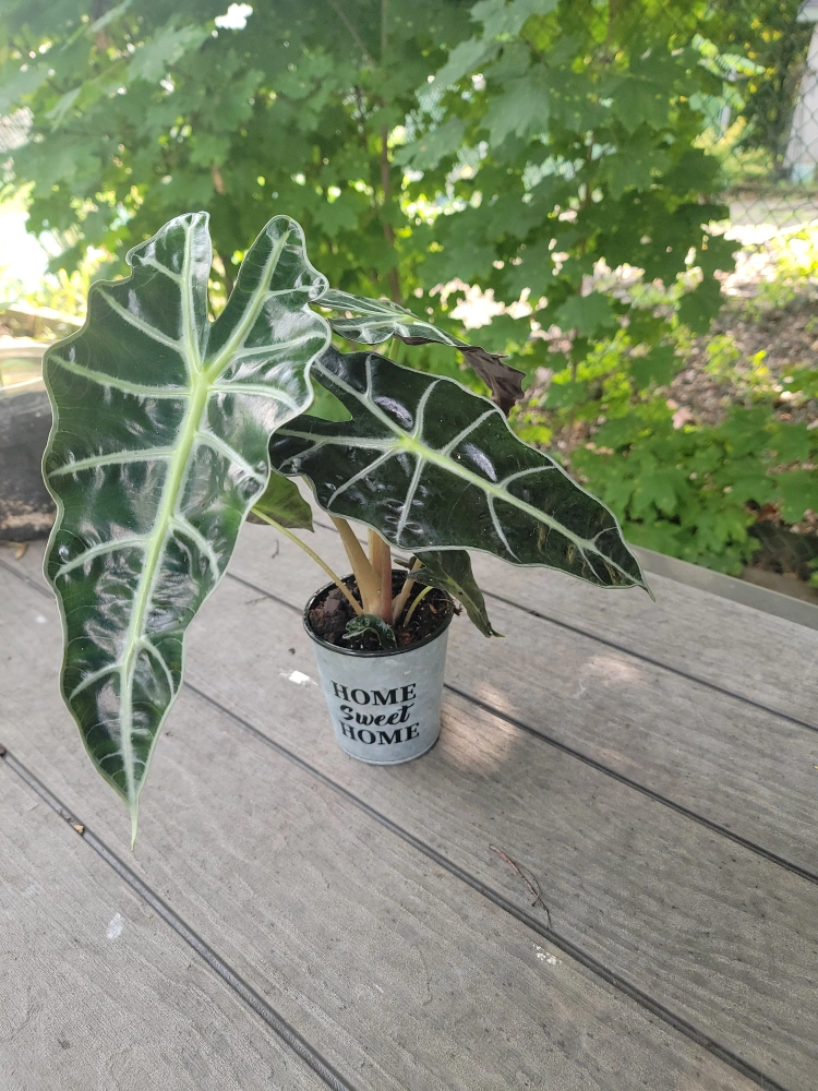 Selling a lovely Alocasia plant, also known as an African Mask plant. It comes in a cute pot that says "Home Sweet Home" on it. This plant would look great in any room and is relatively easy to care for!