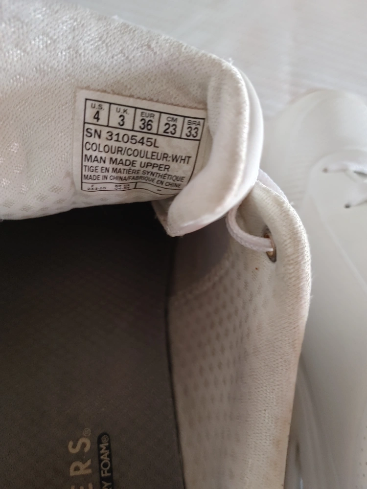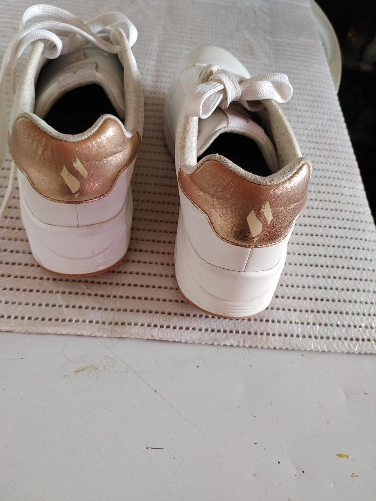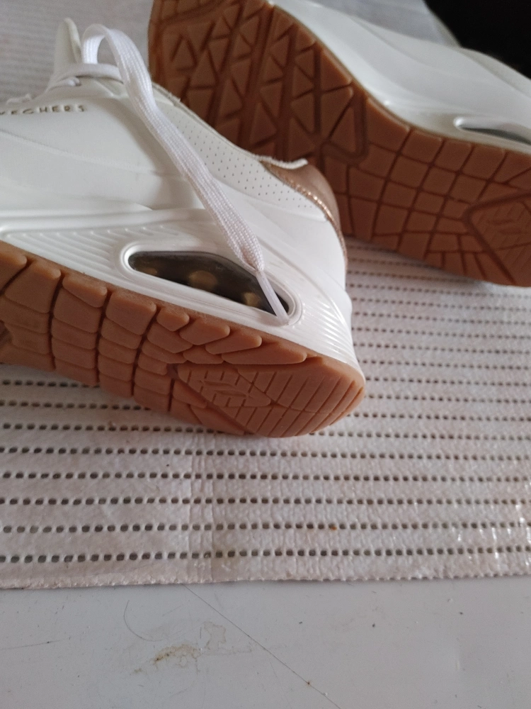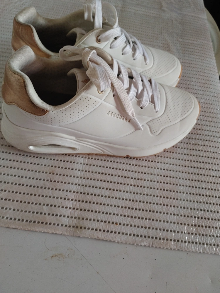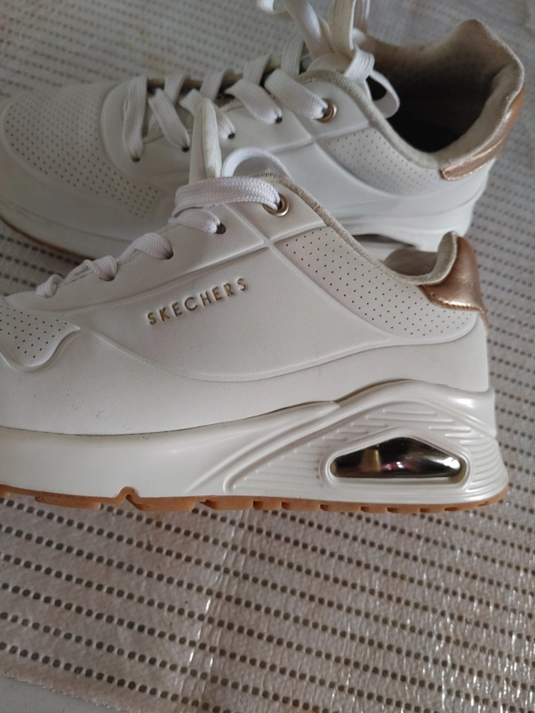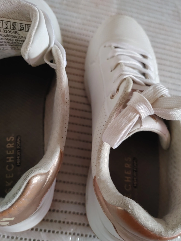 Here are some women's Skechers sneakers in a size 6. They are white with a bronze accent on the heel. The soles are a light brown colour. They have memory foam inside for extra comfort
