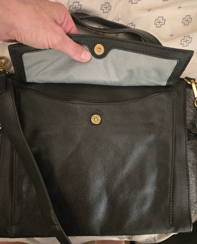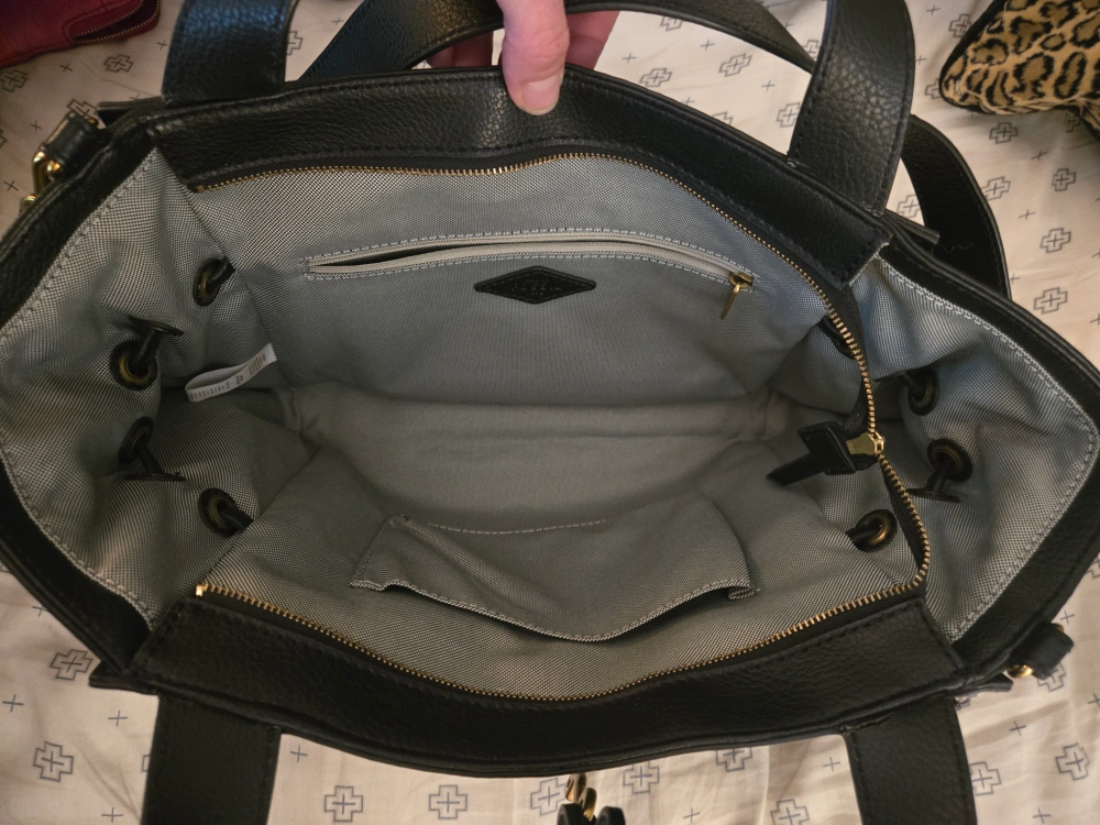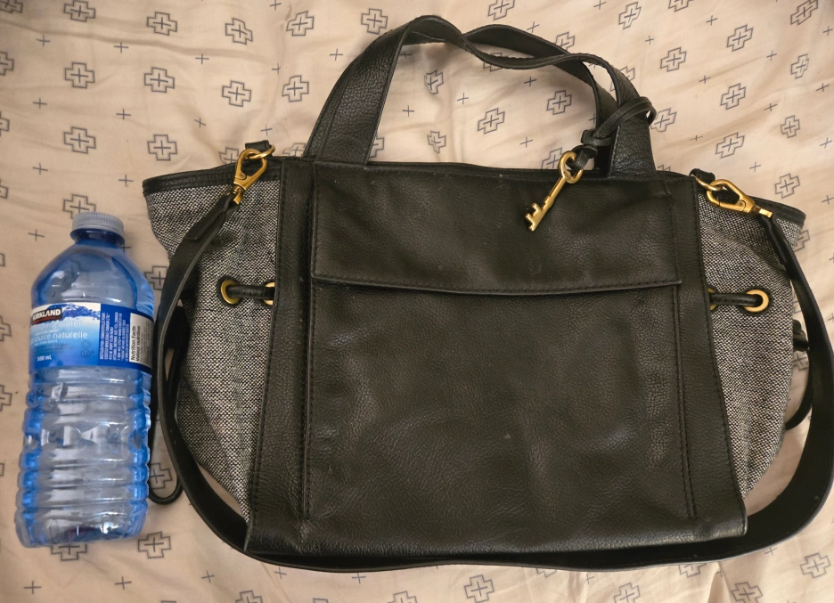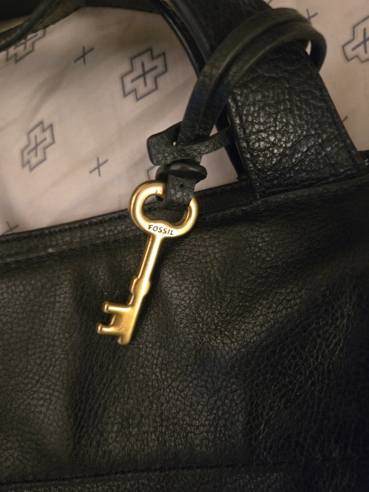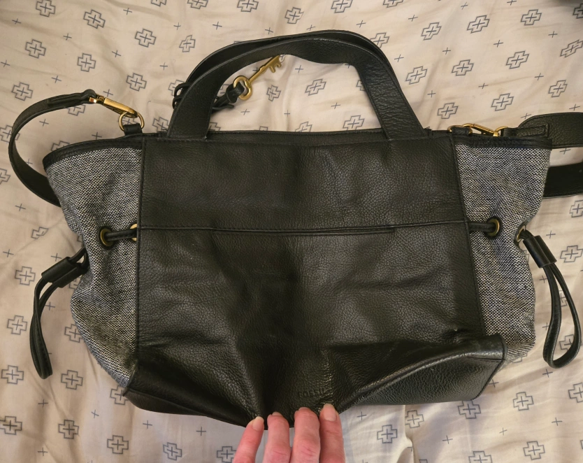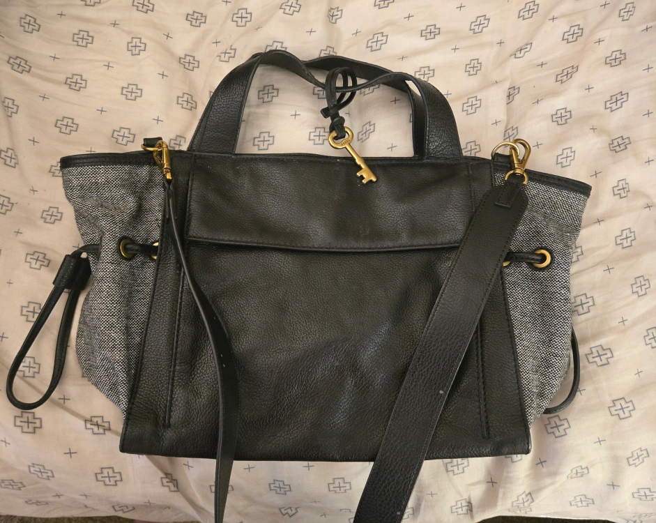 A stylish Fossil satchel featuring a mix of black leather and tweed! It has a unique key charm and a spacious interior. Perfect for everyday use.