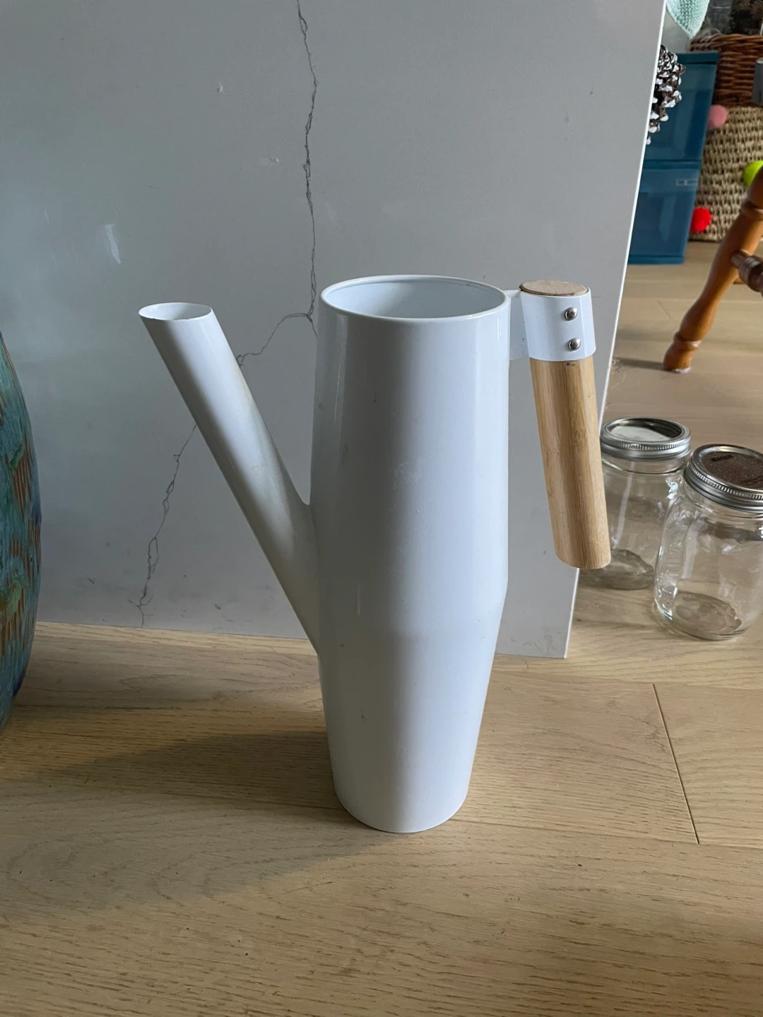 A stylish white watering can perfect for indoor plants or small gardens. The handle is made of wood, adding a touch of natural warmth to its modern design. It's in great condition and ready to help keep your plants happy and hydrated Cash only