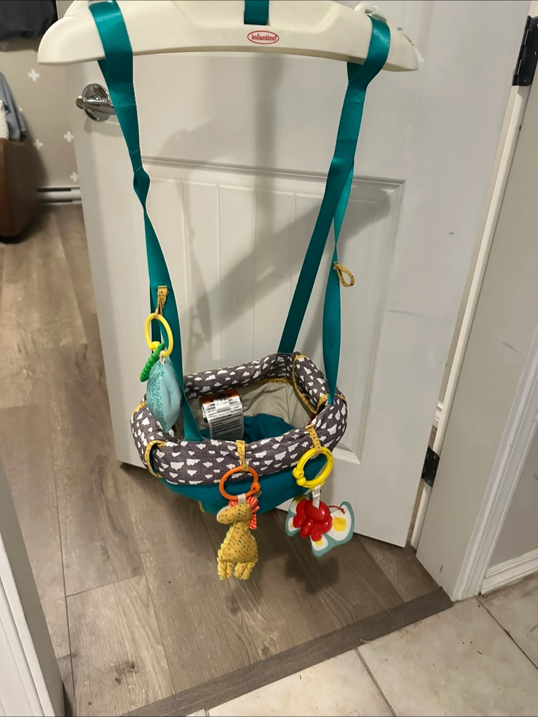 Infantino doorway jumper for your little one! It's in great condition. This jumper easily attaches to most door frames, providing a safe and fun way for your baby to bounce and play. Comes with cute, colourful toys to keep them entertained!