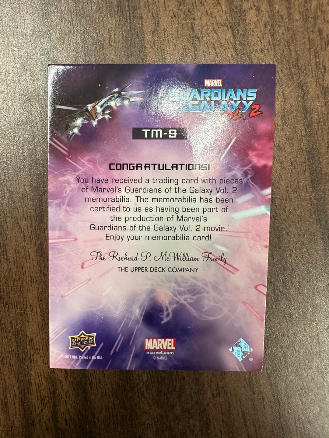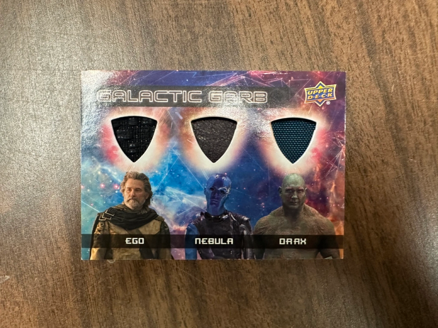 2017 Upper Deck Guardians of the Galaxy Vol. 2 Triple Relic Ego/Nebula/ Drax. I’d say the condition is probably LP but in excellent overall condition.