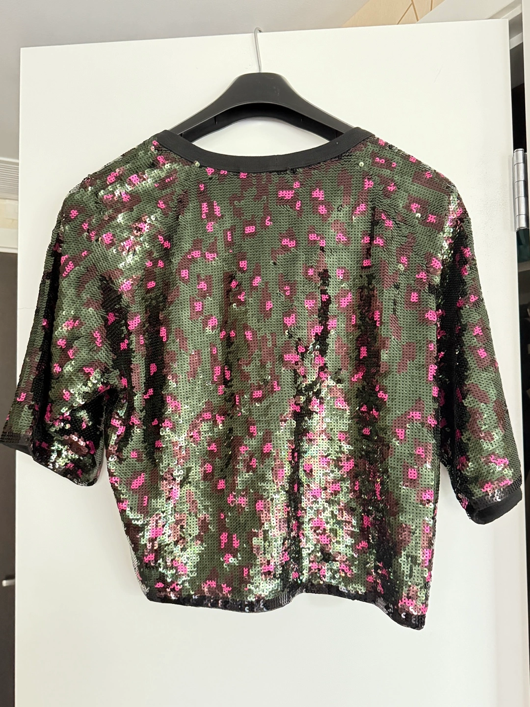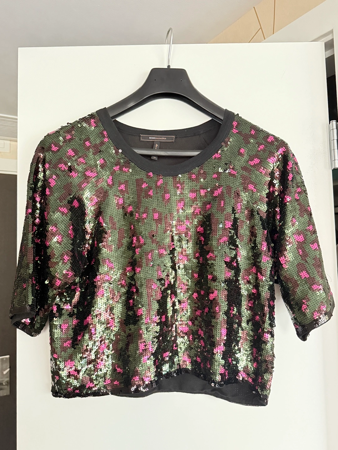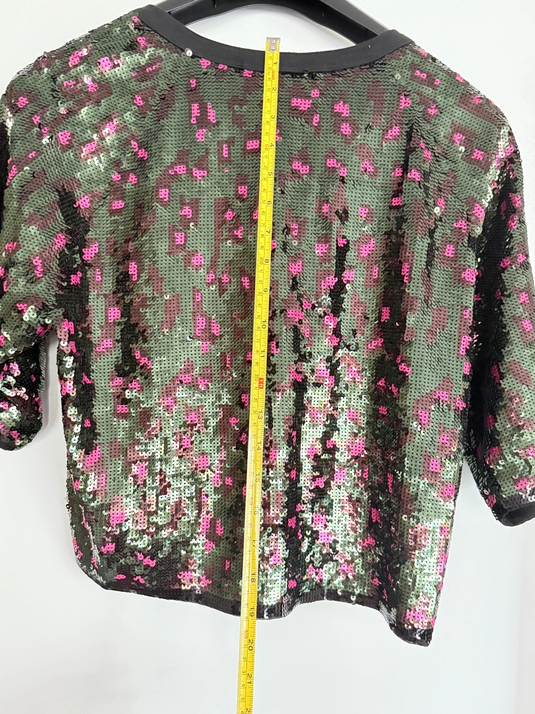 481Selling a BCBGMAXAZRIA sequin top in size XS. It features a unique sequin design with pink and black accents. Perfect for adding a bit of sparkle to your wardrobe! Although is XS, but loose fit, so fitting XS to medium size body shape.