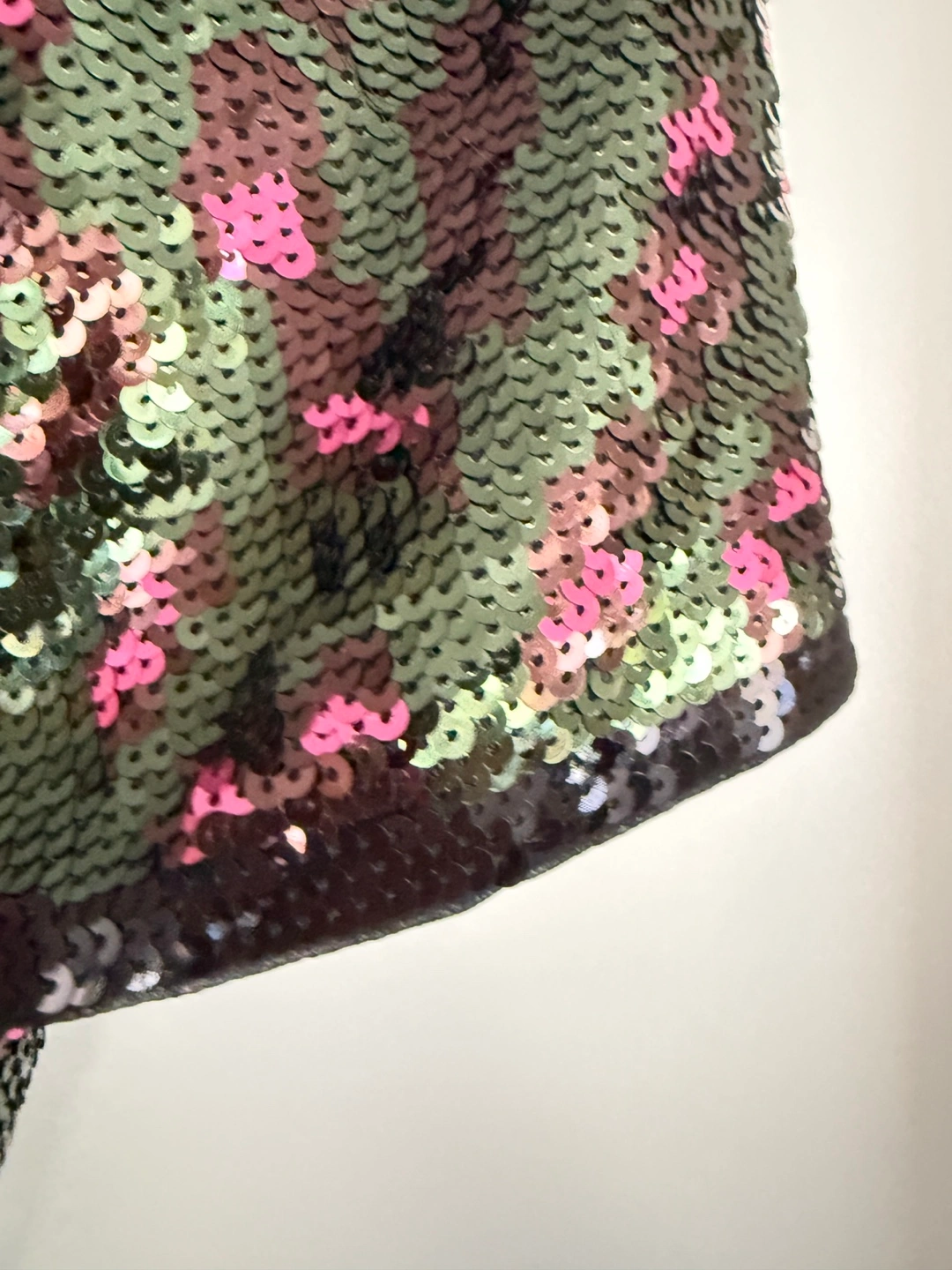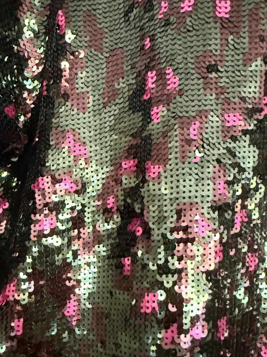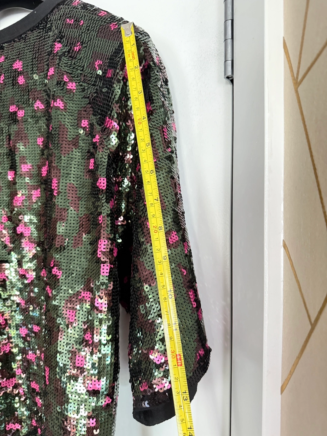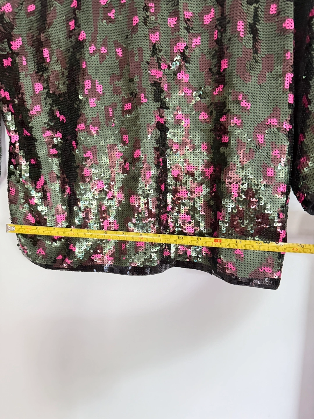 481Selling a BCBGMAXAZRIA sequin top in size XS. It features a unique sequin design with pink and black accents. Perfect for adding a bit of sparkle to your wardrobe! Although is XS, but loose fit, so fitting XS to medium size body shape.