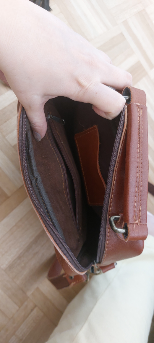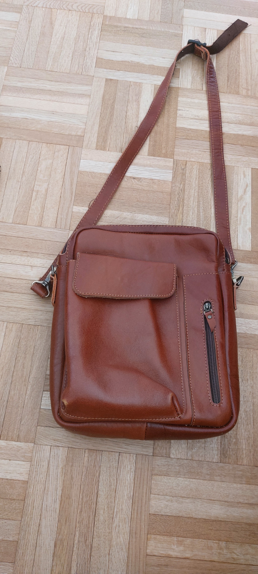 A stylish brown leather crossbody bag! It features multiple pockets for easy organization. Perfect for everyday use
