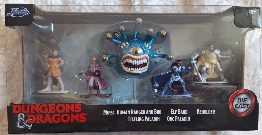 Selling a set of Dungeons & Dragons die-cast figures! The box includes Minsc, Human Ranger and Boo, Elf Bard, Beholder, Tiefling Paladin, and Orc Paladin figures. It's a great set for any D&D fan