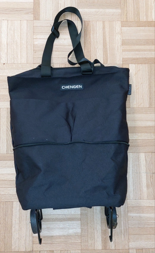 Looking to sell a black rolling tote bag from CHENGEN. It has both a shoulder strap and wheels for easy transport. Great for shopping or travel!