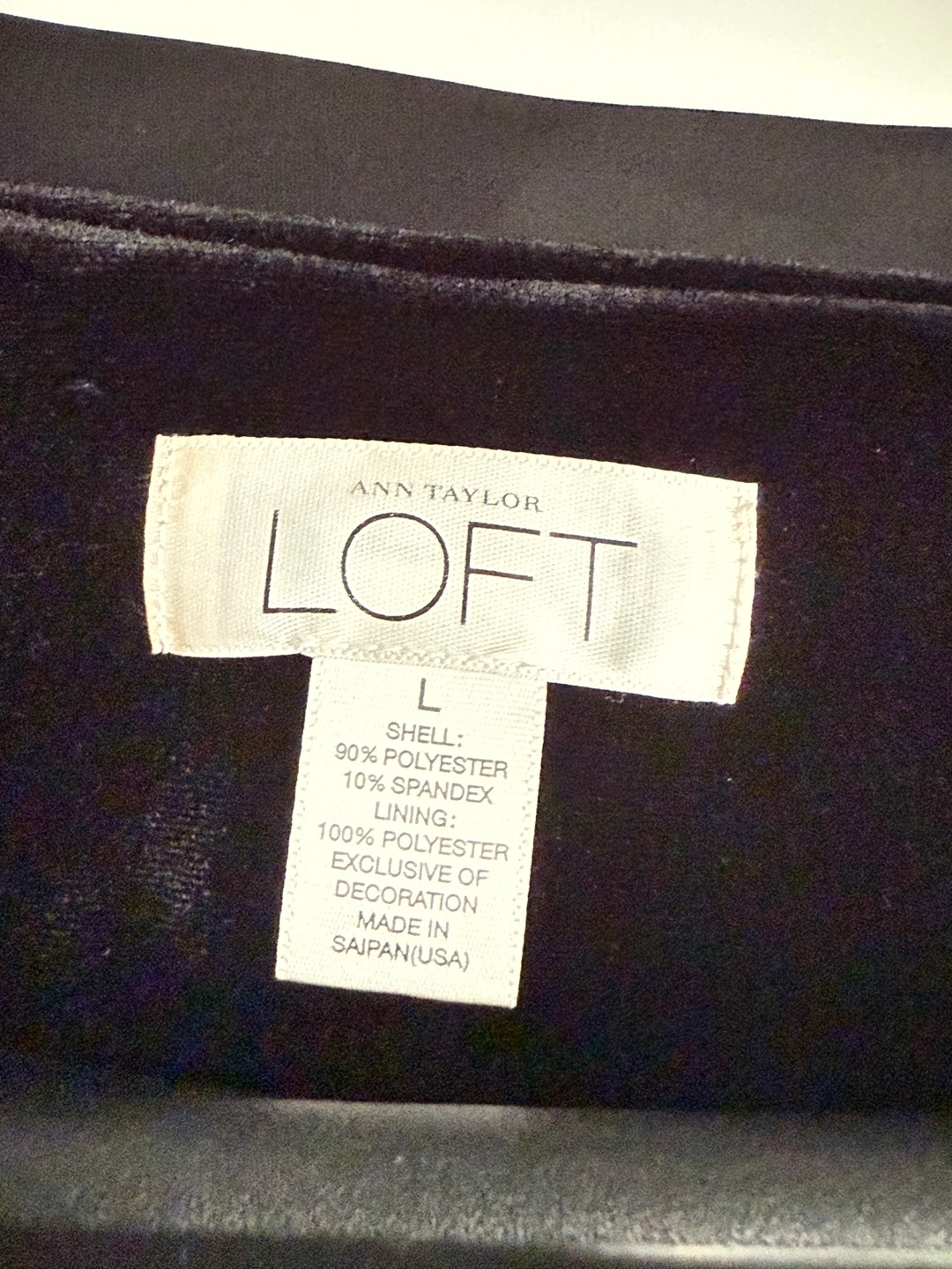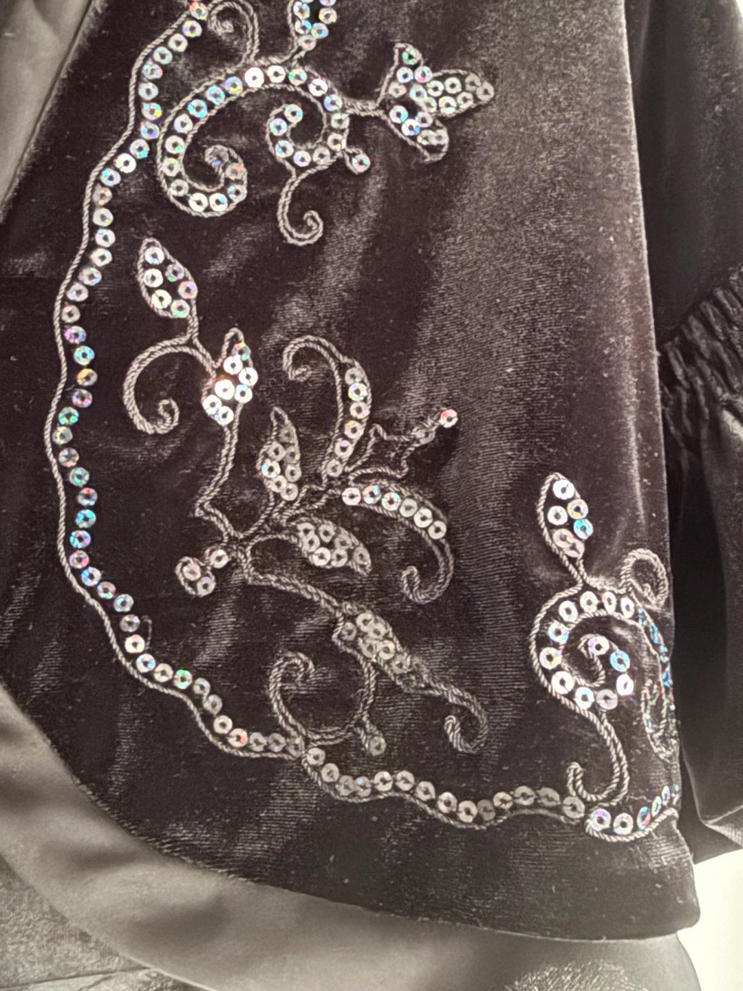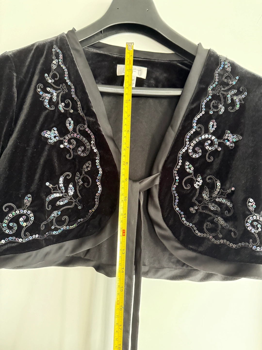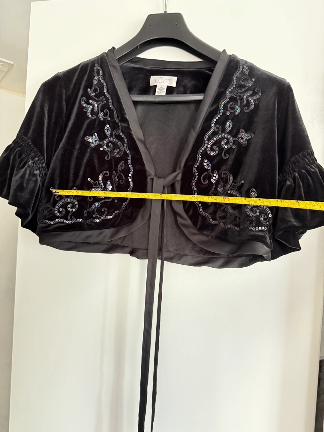 481This is a lovely black velvet bolero from LOFT. It's a size large and features beautiful sequin detailing. The shell is 90% polyester and 10% spandex, with a 100% polyester lining. It's in great condition!