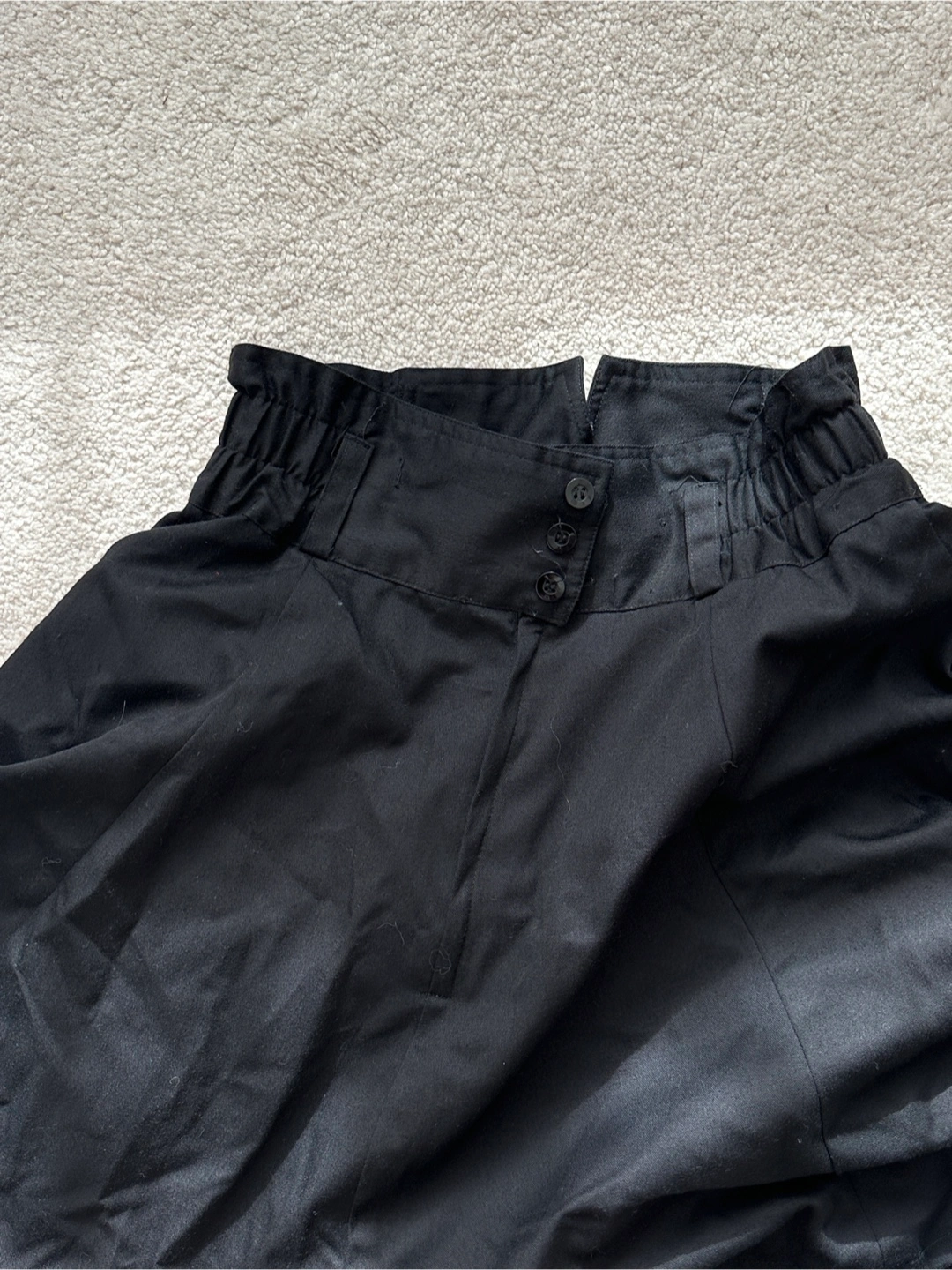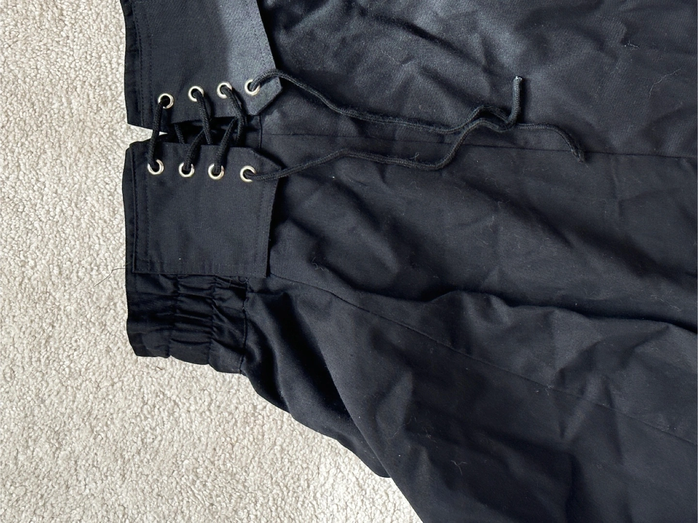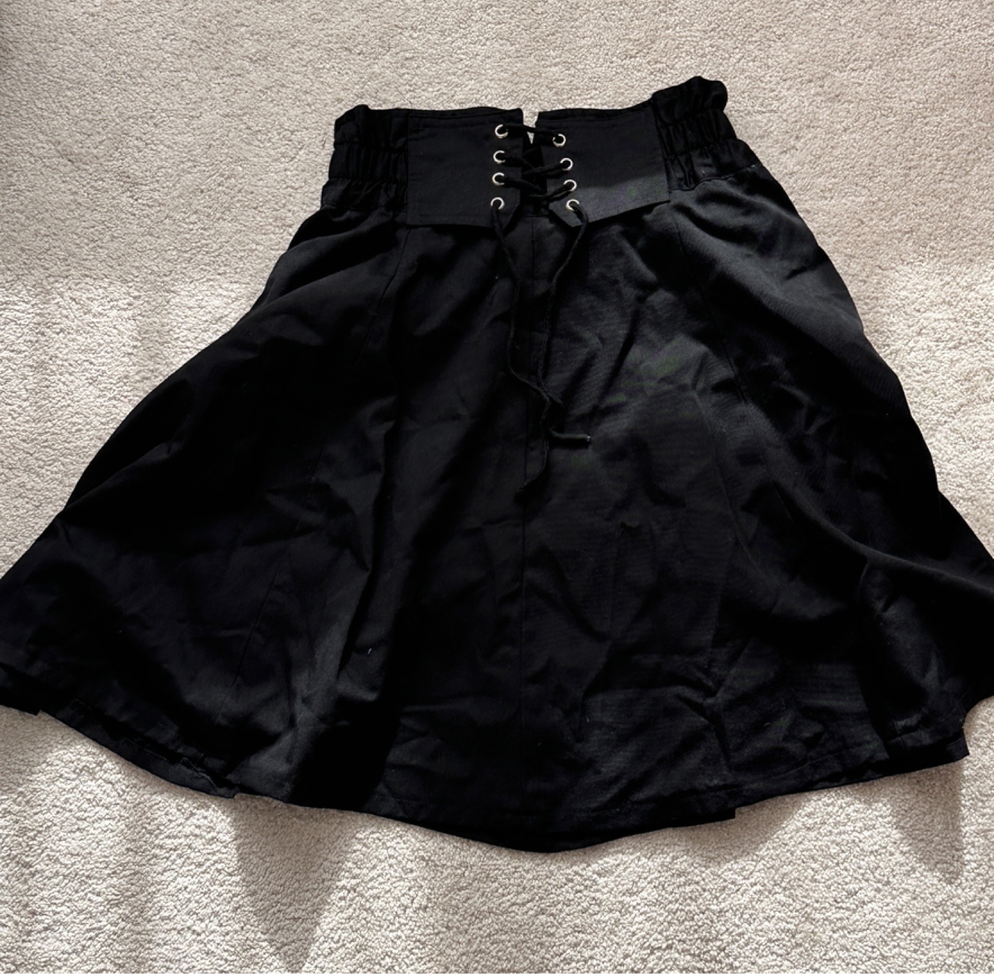 a cute edgy black mini skirt! It features a unique lace-up detail at the back and a comfortable elastic waistband. It has pockets!!