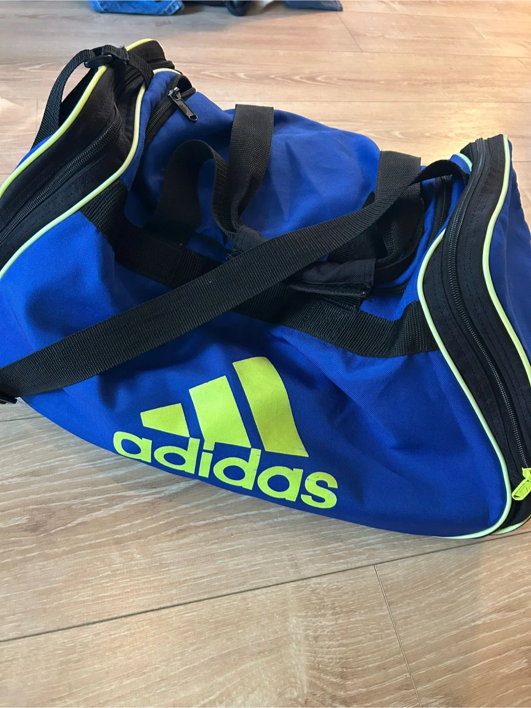 Selling a blue Adidas duffel bag! It's in great condition and ready for your gym sessions or weekend trips. The bag features black straps and vibrant yellow accents. Perfect for carrying your essentials in style. Pickup at Barclay Heritage Square in the West End. Cash only.