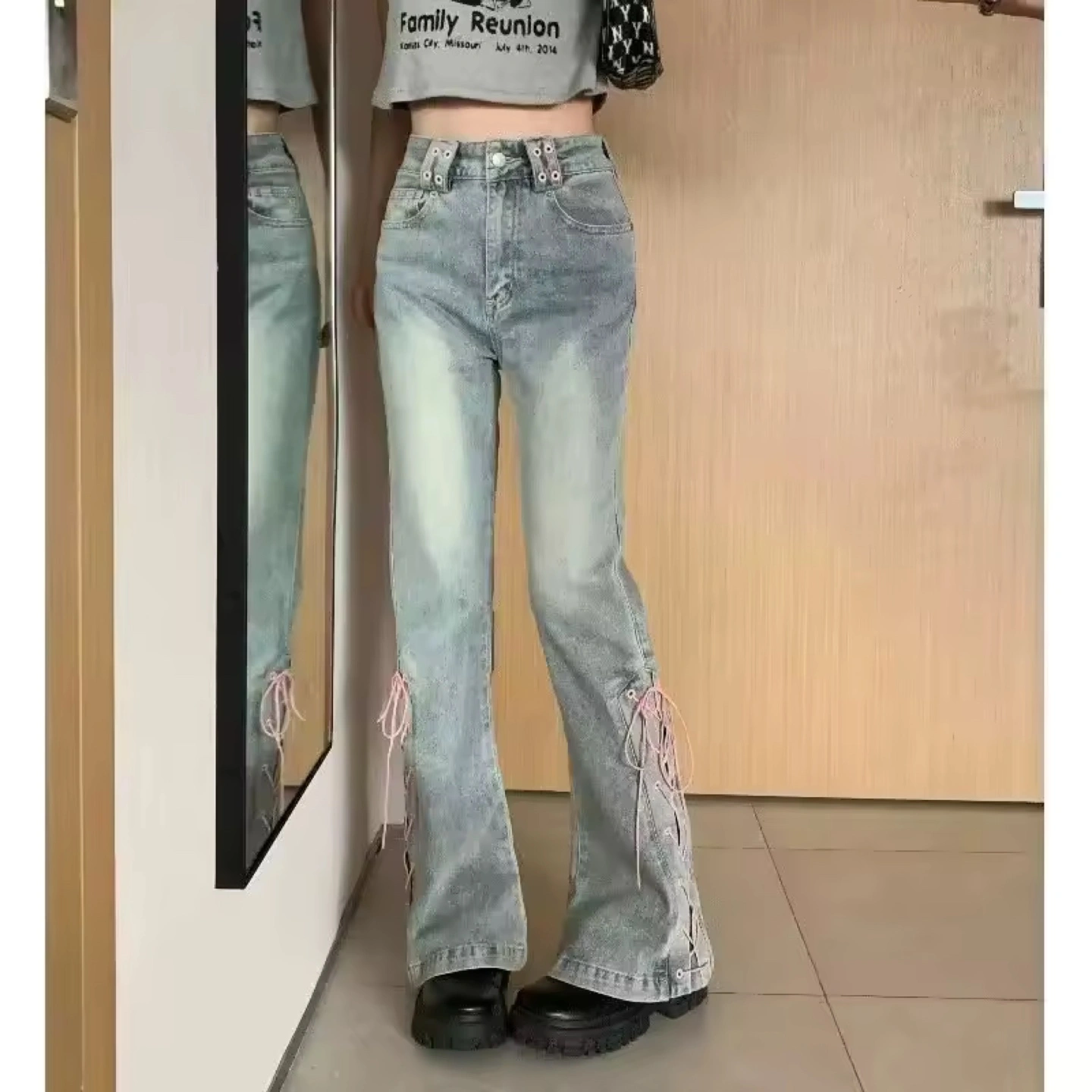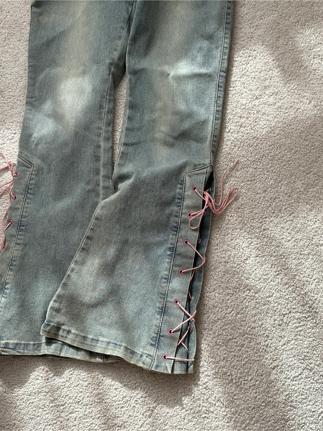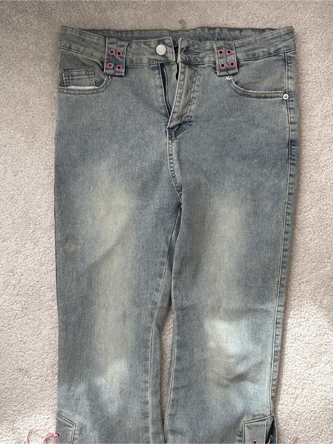 M/L pair of light wash flare jeans with unique pink lace detailing on the sides. Ive barely worn them because the size doesn’t fit me. The denim has a nice faded look