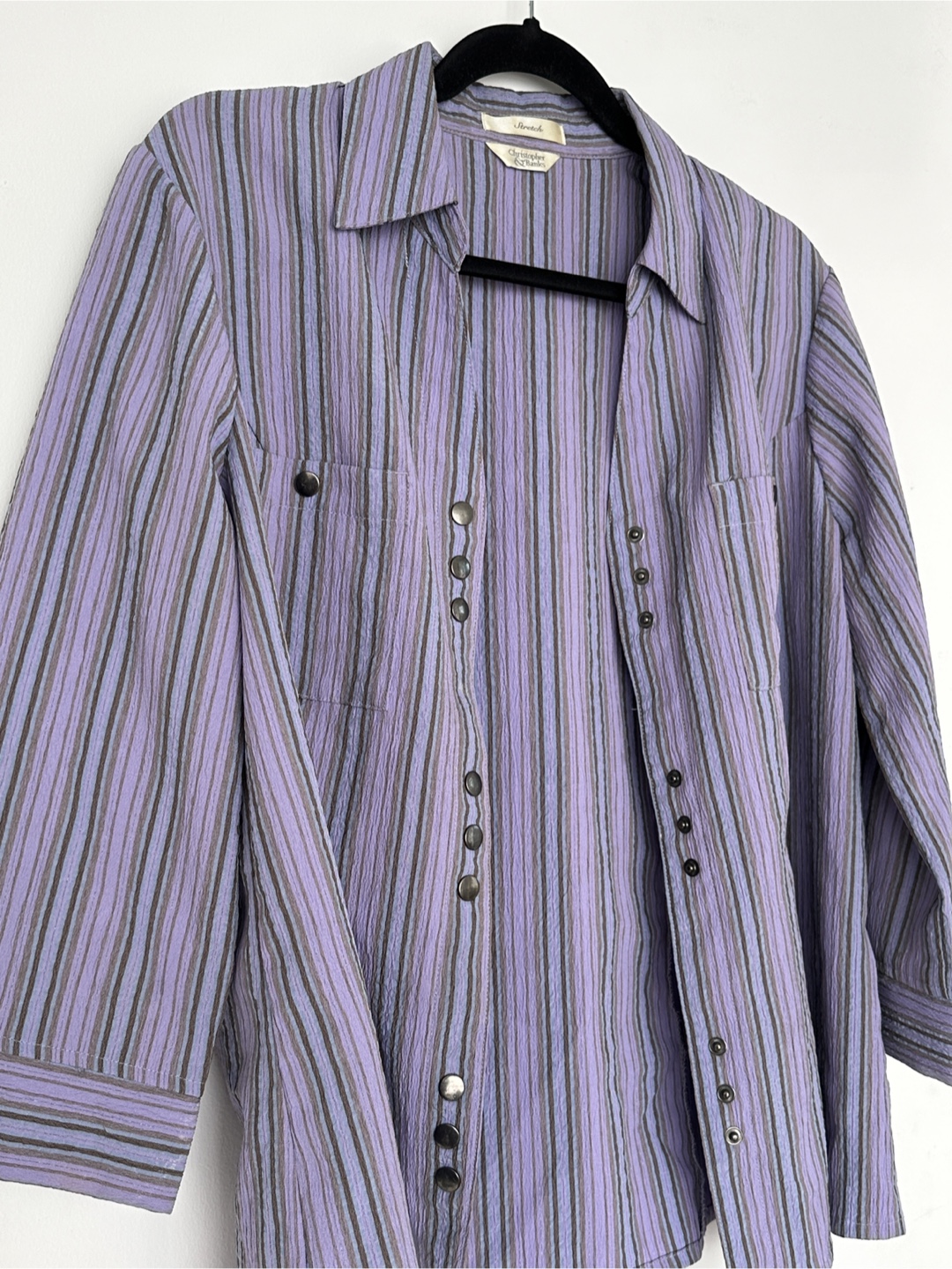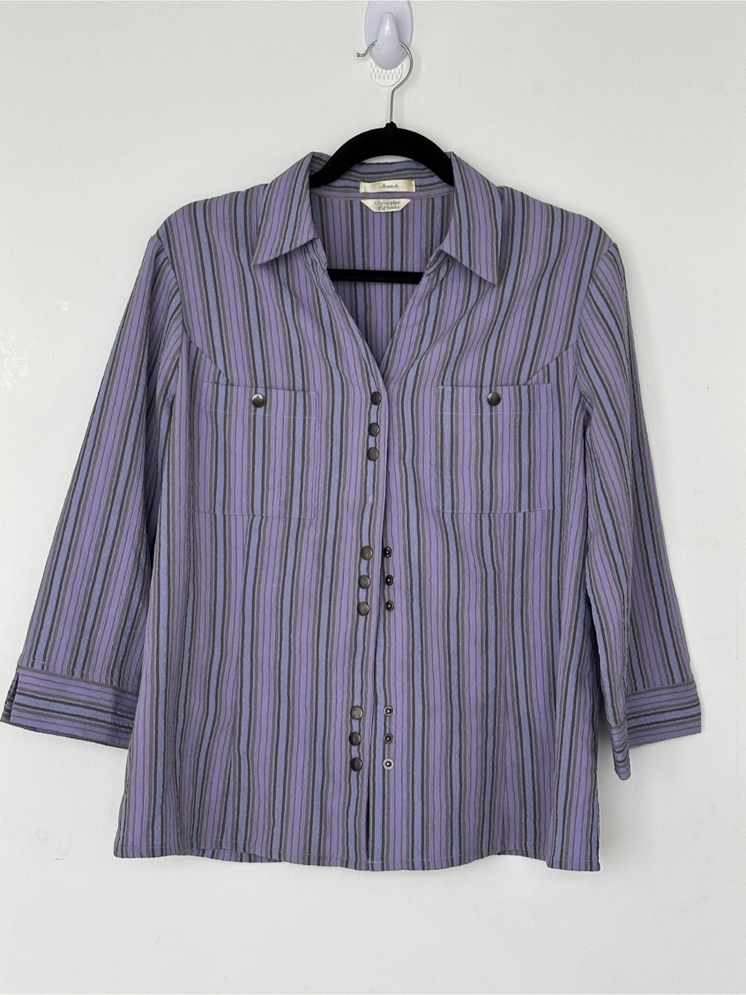 Here's a lovely striped button-down shirt features a unique button design and a comfortable fit. Its very charming!!