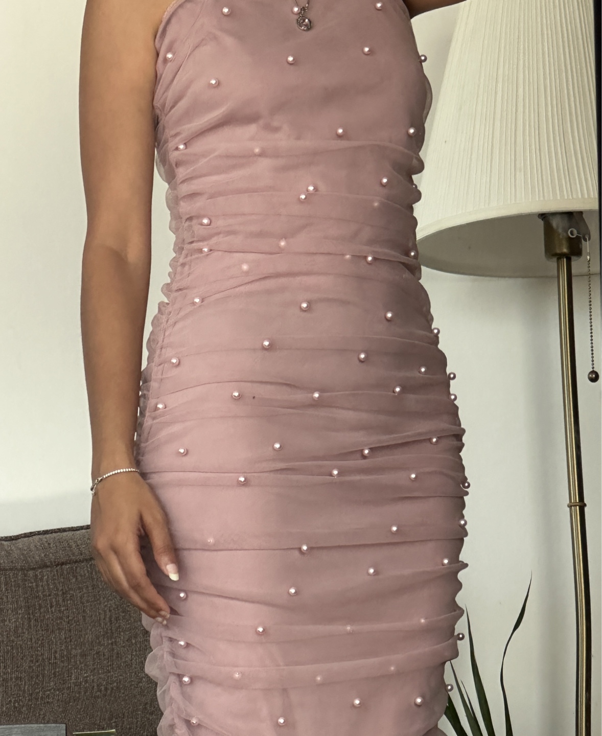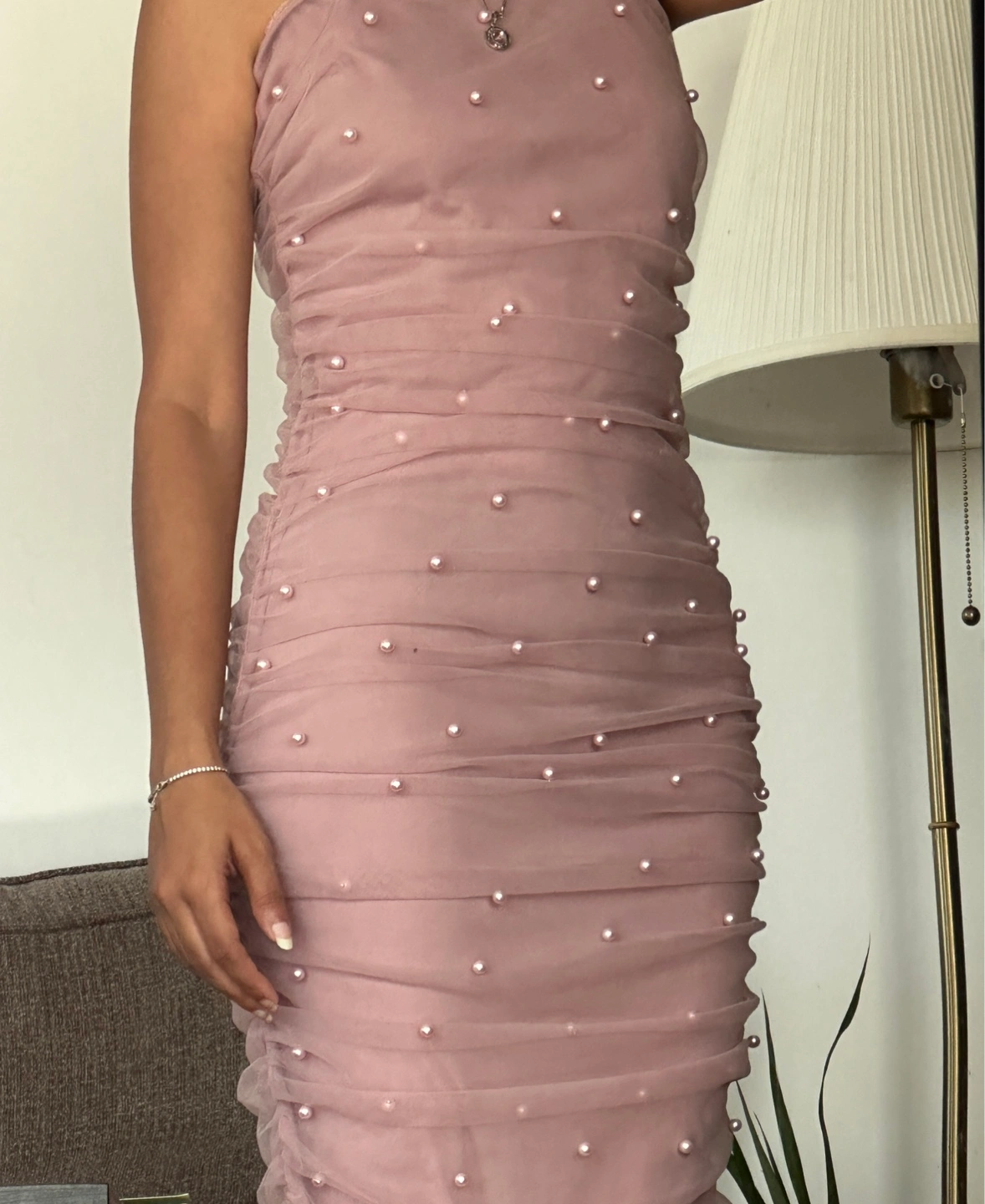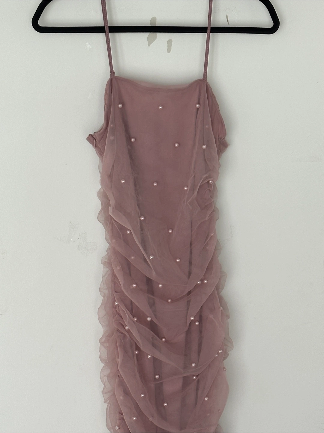 a cute pink dress with pearl detailing! It's a fun and flirty dress that's perfect for a night out or a special occasion. The dress has a flattering silhouette and the pearl embellishments add a touch of elegance