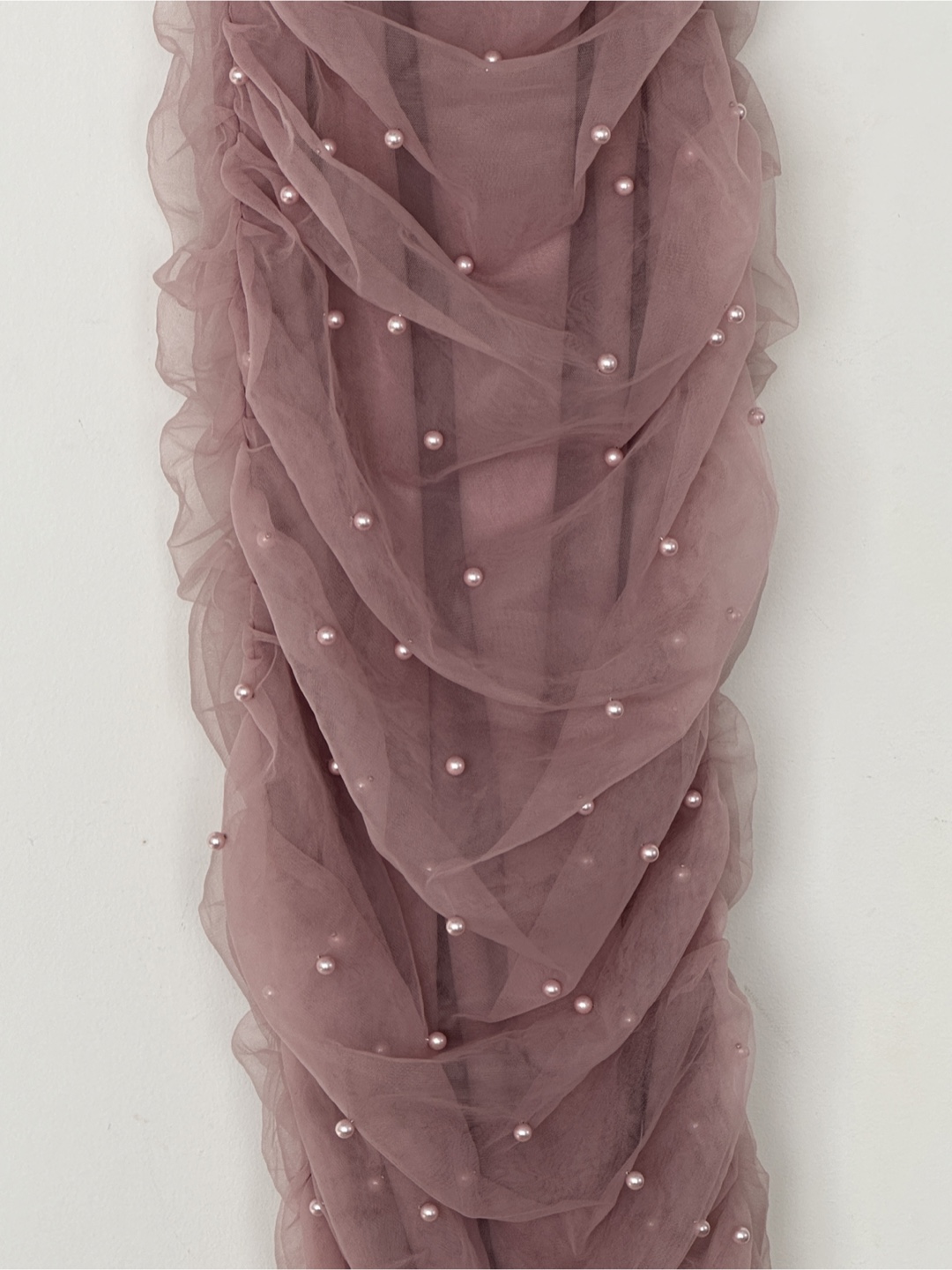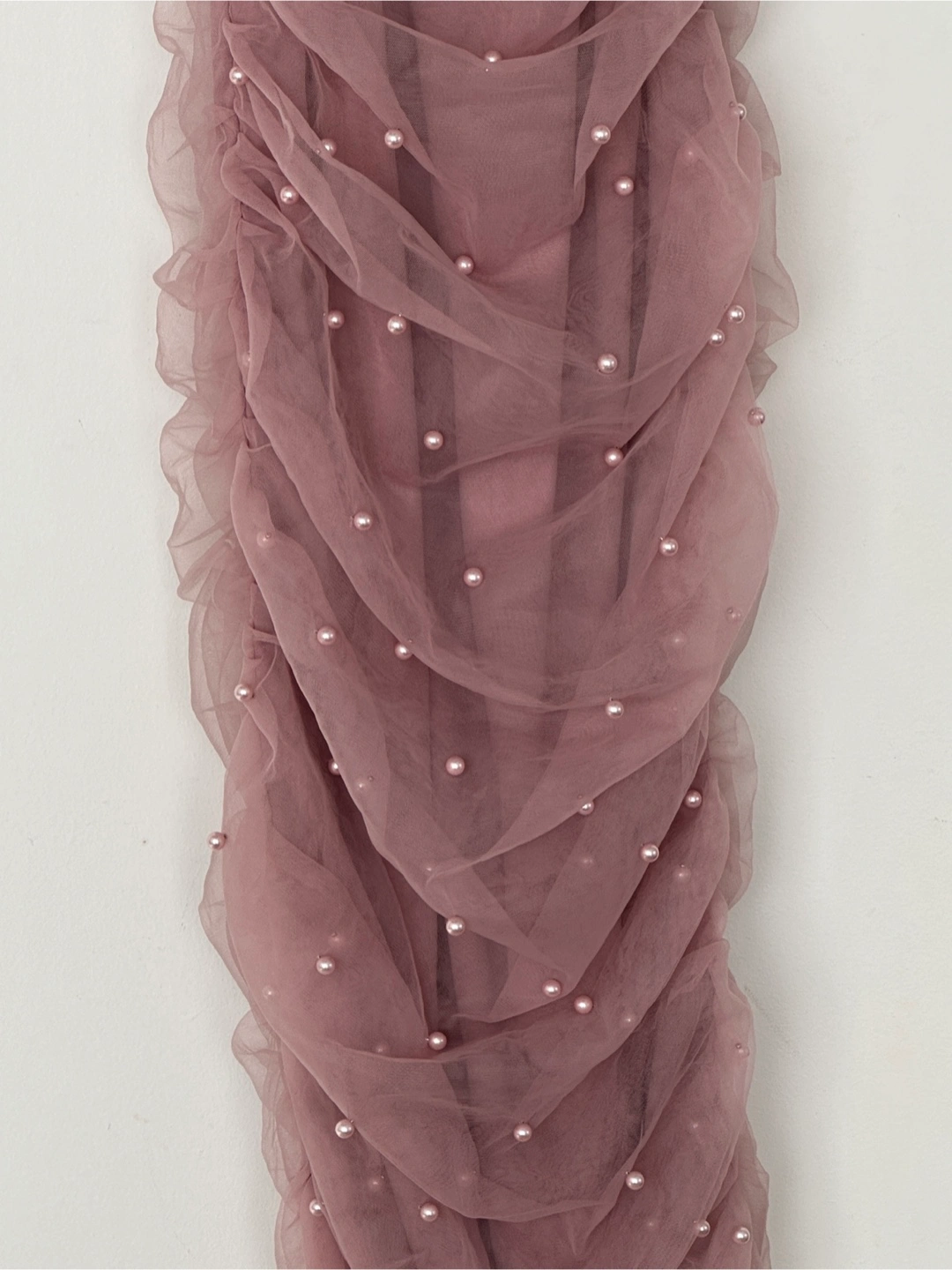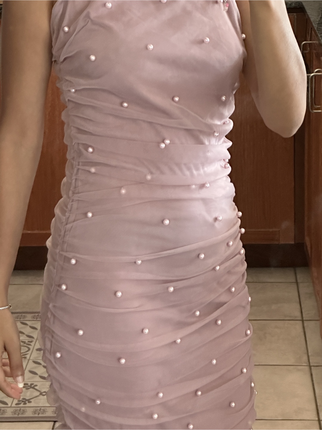 a cute pink dress with pearl detailing! It's a fun and flirty dress that's perfect for a night out or a special occasion. The dress has a flattering silhouette and the pearl embellishments add a touch of elegance