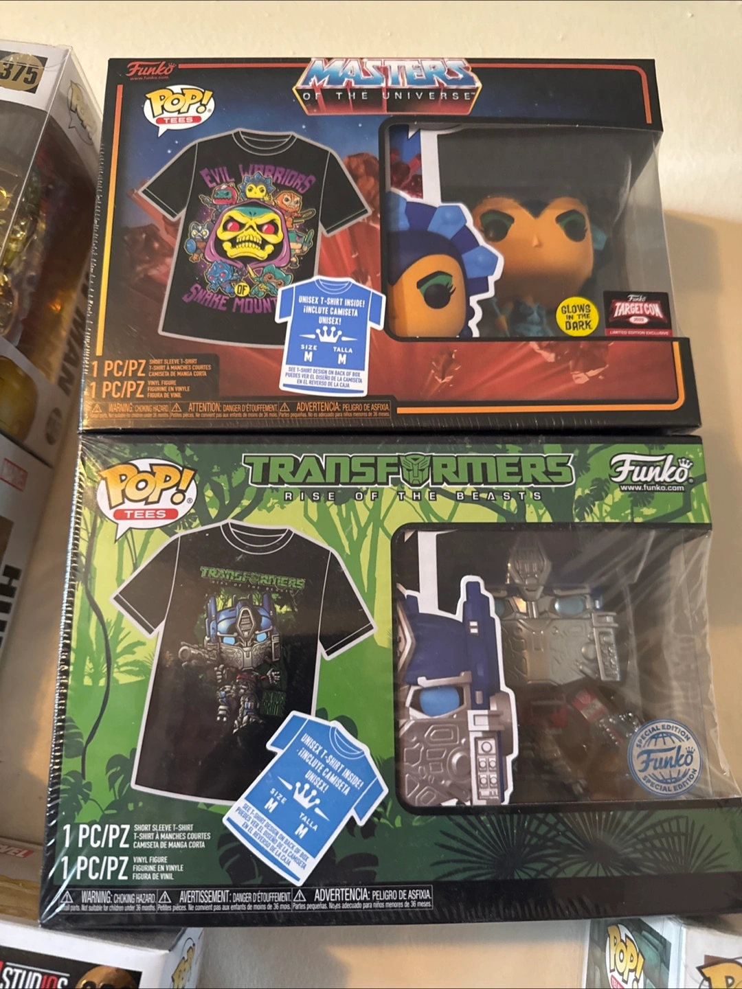 1000+Selling two Funko Pop! Tees sets: Transformers: Rise of the Beasts and Masters of the Universe Evil Warriors. Each set includes a T-shirt (size M) and a matching Funko Pop! figure. Perfect for any collector!