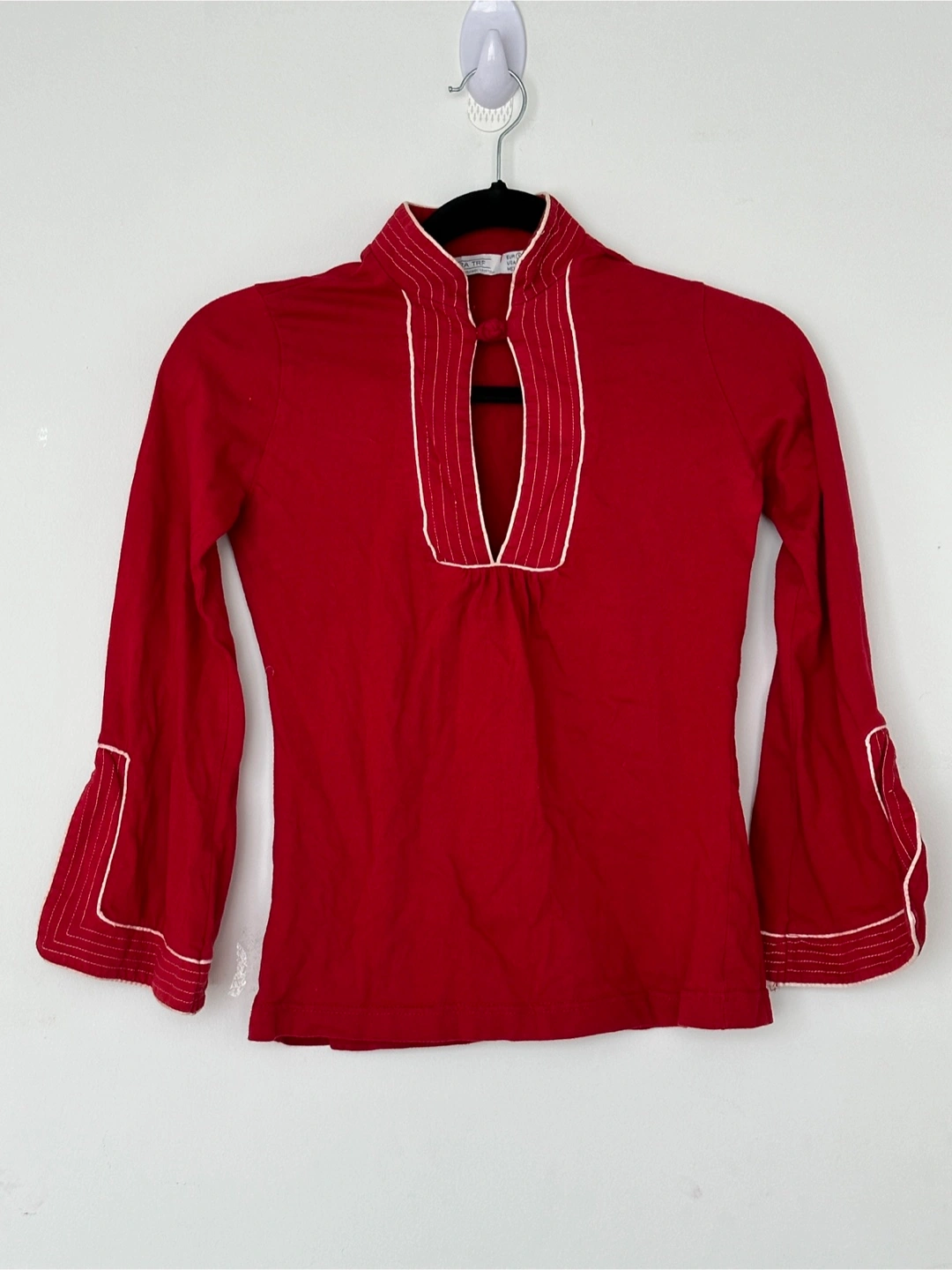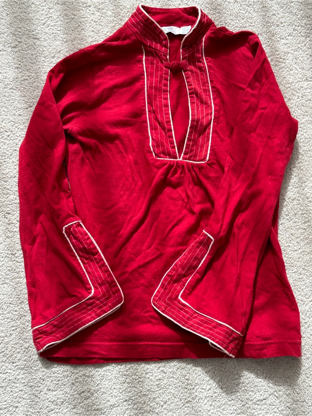 A lovely red long-sleeve top with unique white detailing around the collar, front, and sleeves! Perfect for adding a pop of colour to your wardrobe and staying cozy.