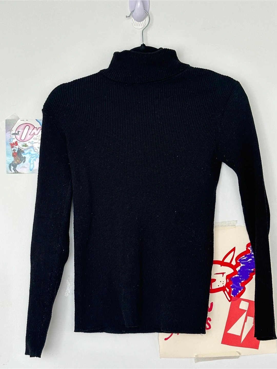 A simple black turtleneck sweater, perfect for layering or wearing on its own! The material has a ribbed texture.