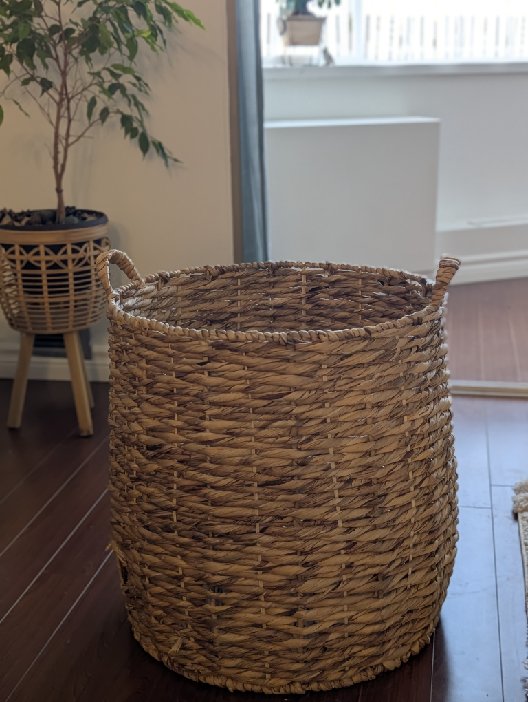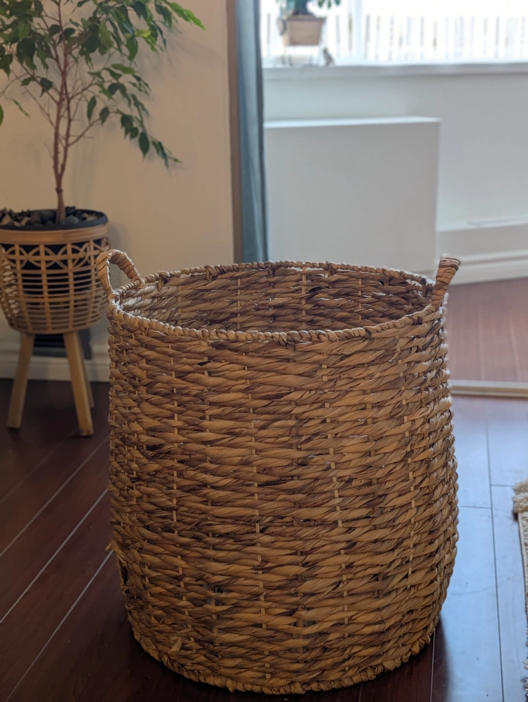 Selling a beautiful woven wicker basket with handles. It's a great size for storing blankets, toys, or laundry. The natural woven material adds a warm and cozy touch to any room. It's in great condition and ready for a new home.
