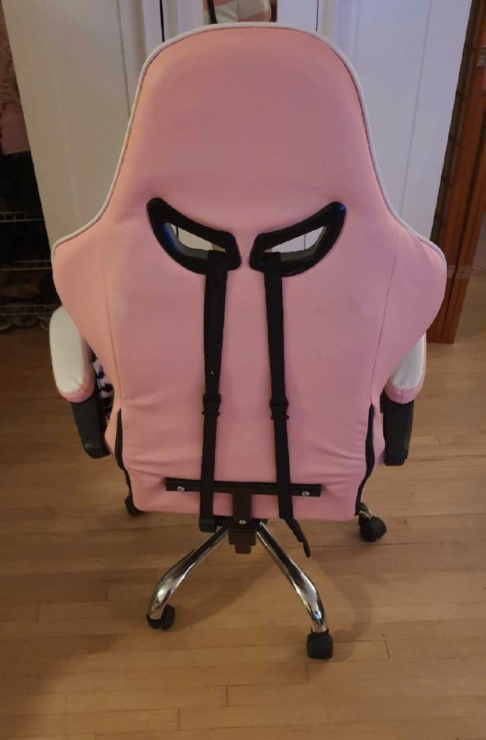 Selling a Vinsetto gaming chair in pink and white. Height and back angle adjustable. Perfect for gaming or working from home. Has some wear and tear, but nothing that affects its functionality. New ones sell around $200. Check out my profile for other furniture! If you've read this and checked my profile, tell me & I'll give you a $5 discount! π