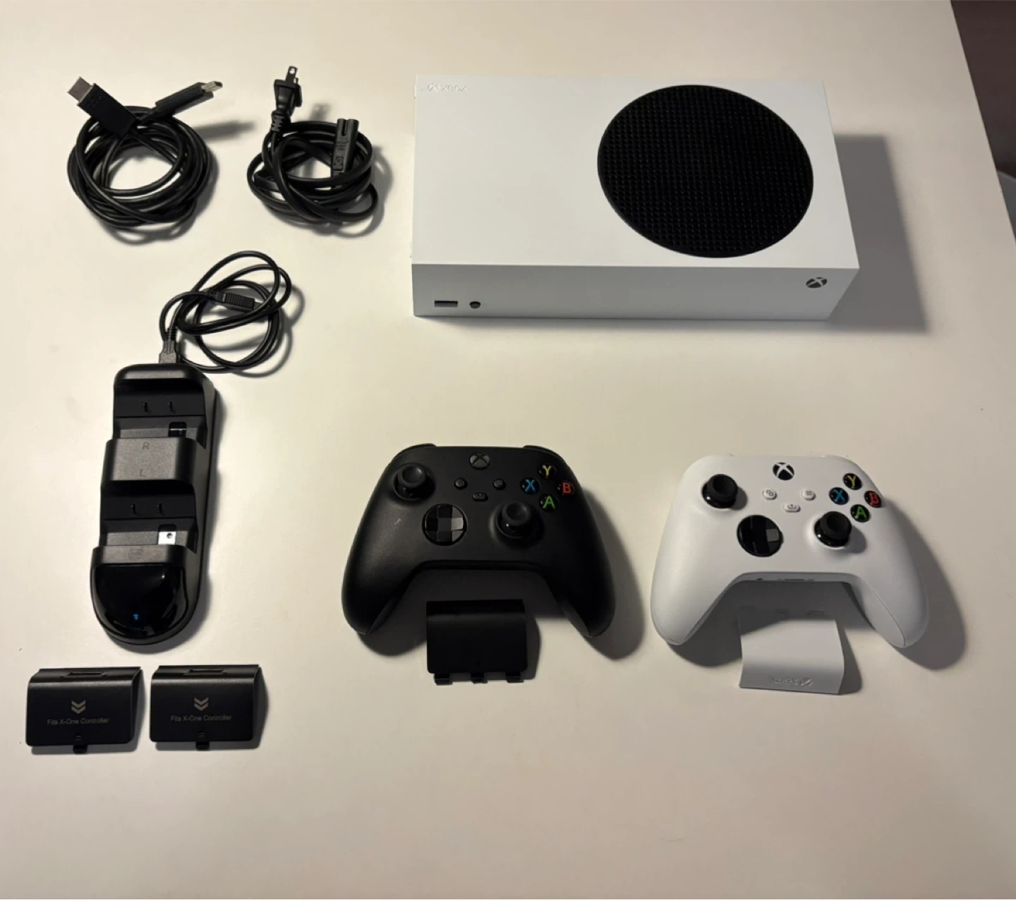 Selling a like-new Xbox Series S console! It comes with the original box and all components, including two controllers (one black, one white), charging station, and all necessary cables. Ready for a new home!