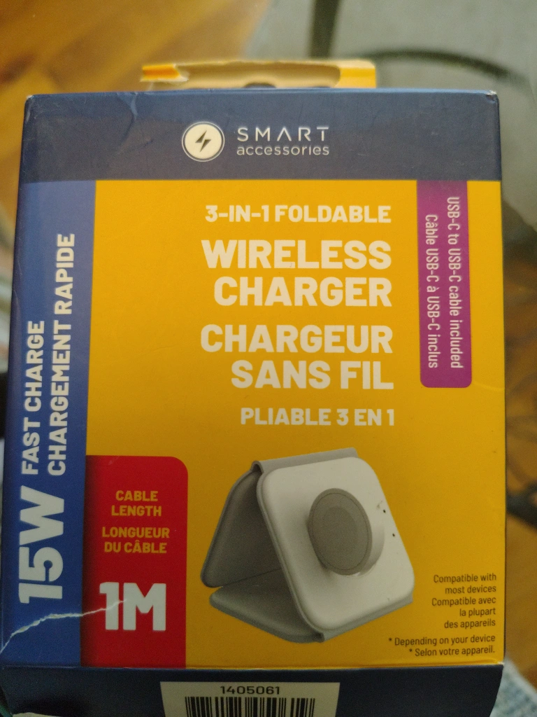 Selling a brand new Smart Accessories 3-in-1 foldable wireless charger! It's a 15W fast charger that's compatible with most devices. It also includes a USB-C to USB-C cable. The cable length is 1M. The box is included!