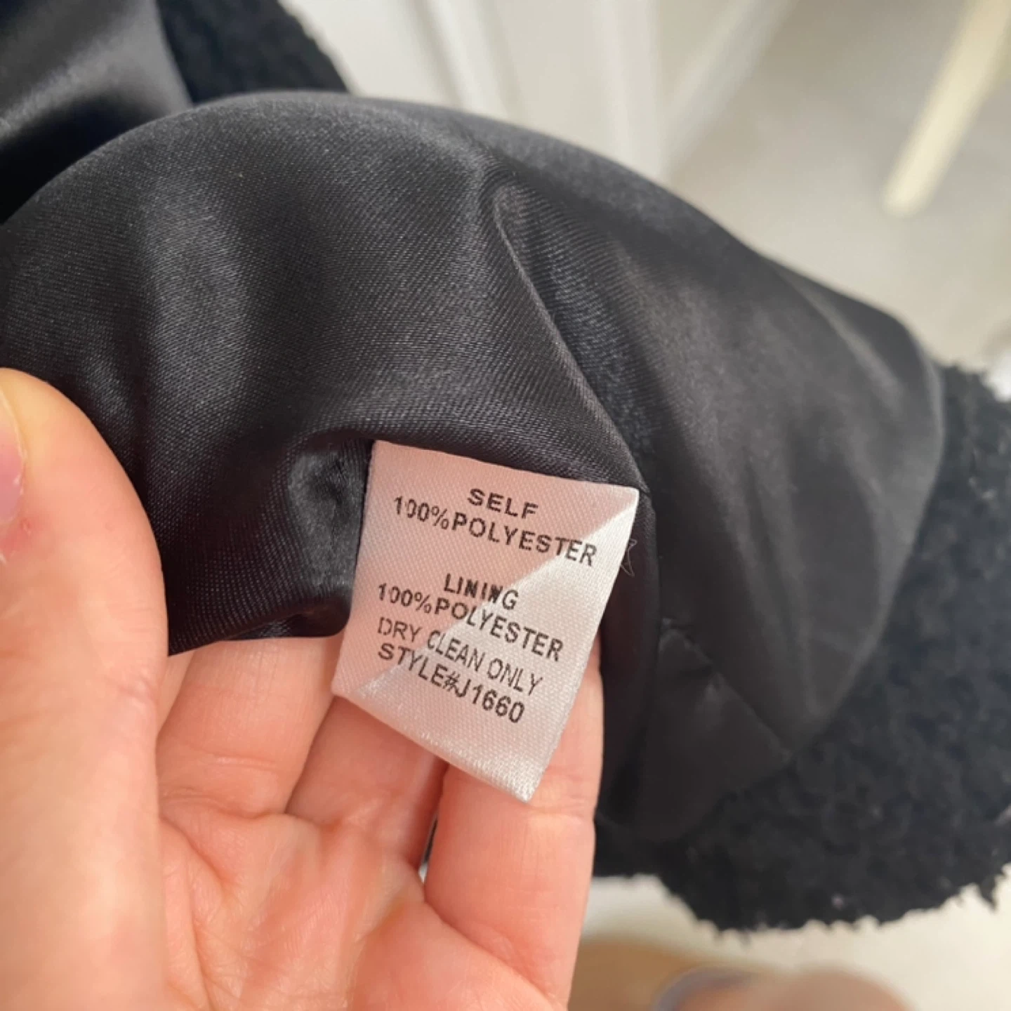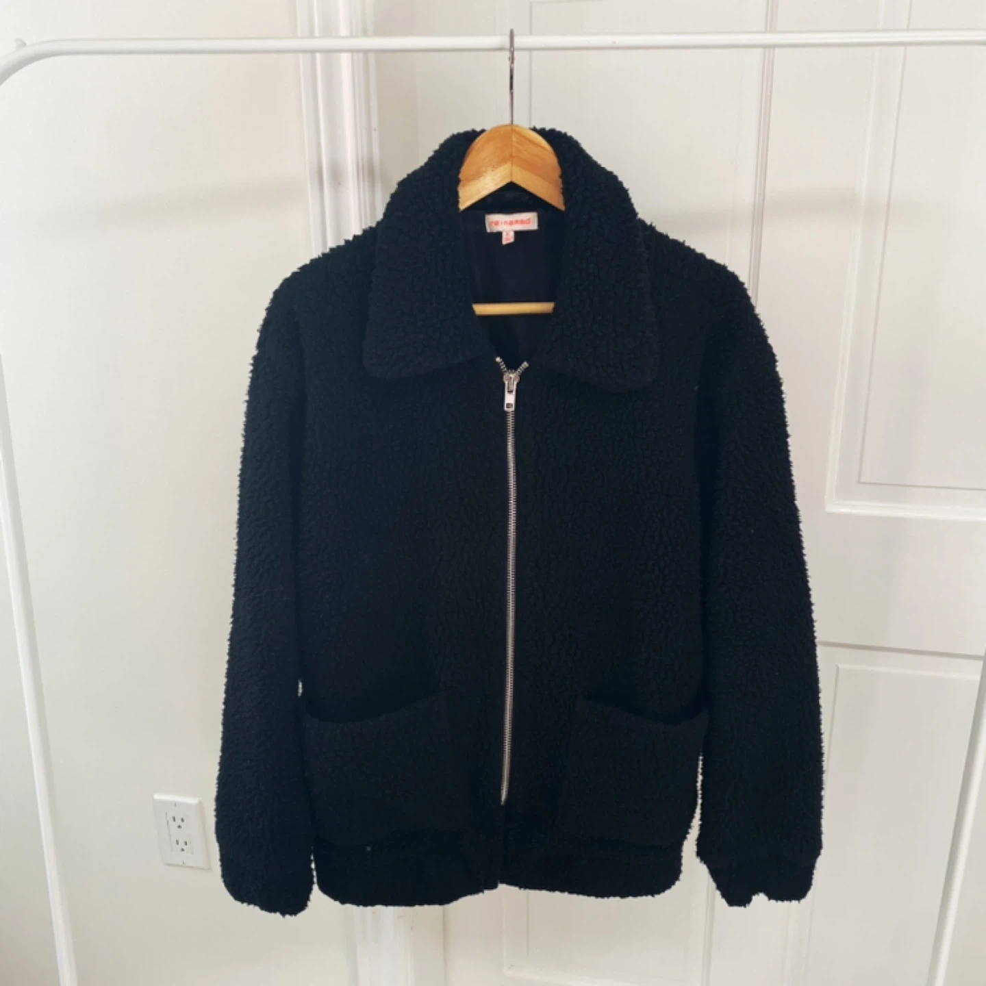 Cozy up in this black sherpa jacket from re:named! It's a size medium and made with 100% polyester for both the self and lining. The style number is J1660. Dry clean only to keep it looking its best!