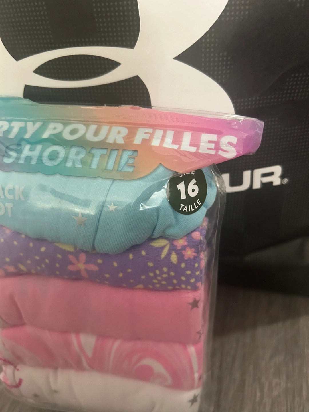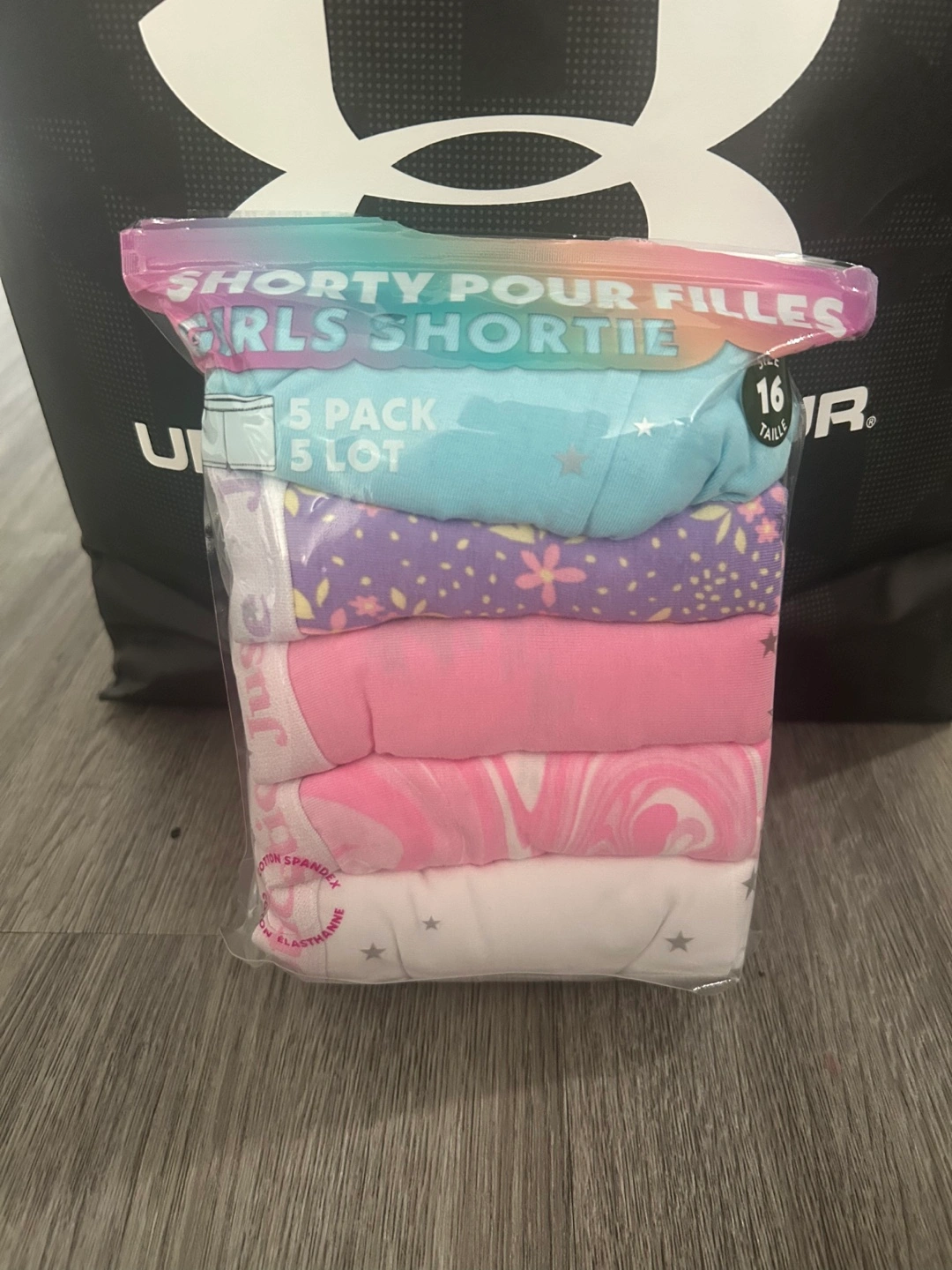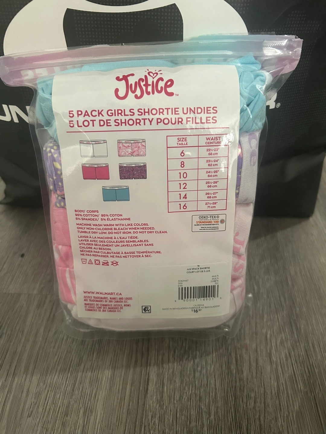 45I'm selling a brand new 5-pack of Justice girls shortie undies! They are size 16 and made of 95% cotton and 5% spandex for a comfy fit. These are super cute with a variety of colours and patterns. No porch pick up Pick up only Beatrice and Wilson Oshawa