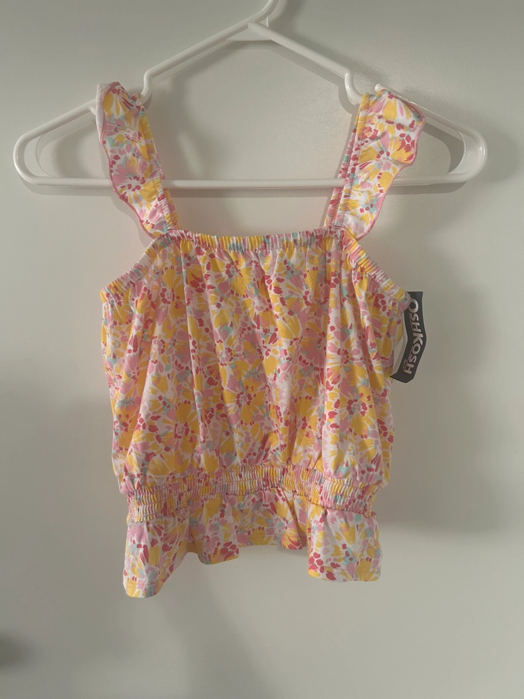 45This cute OshKosh B'gosh top is perfect for a sunny day! It features a lovely floral pattern in shades of yellow, pink, and white. The size is 8, and it's in great condition. No porch pick up Pick up only Beatrice and Wilson Oshawa