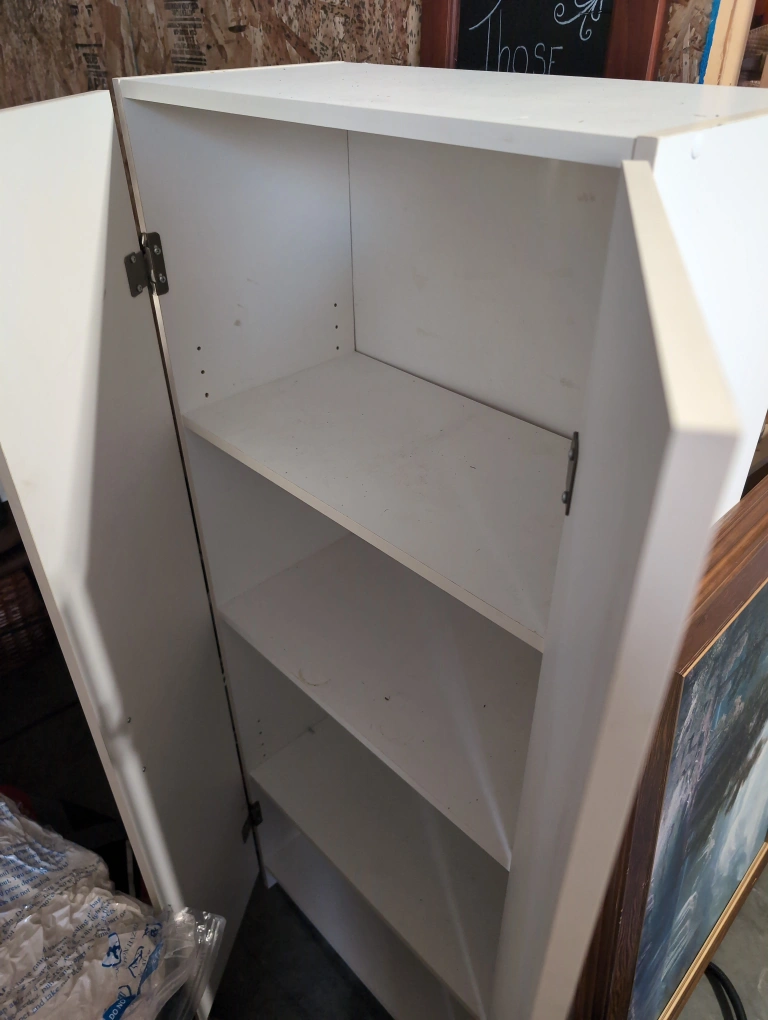 Here's a simple white cabinet with shelves, perfect for extra storage! It has two doors with silver-tone handles, and the inside features three shelves for organizing your items. It's in good condition and ready for a new home