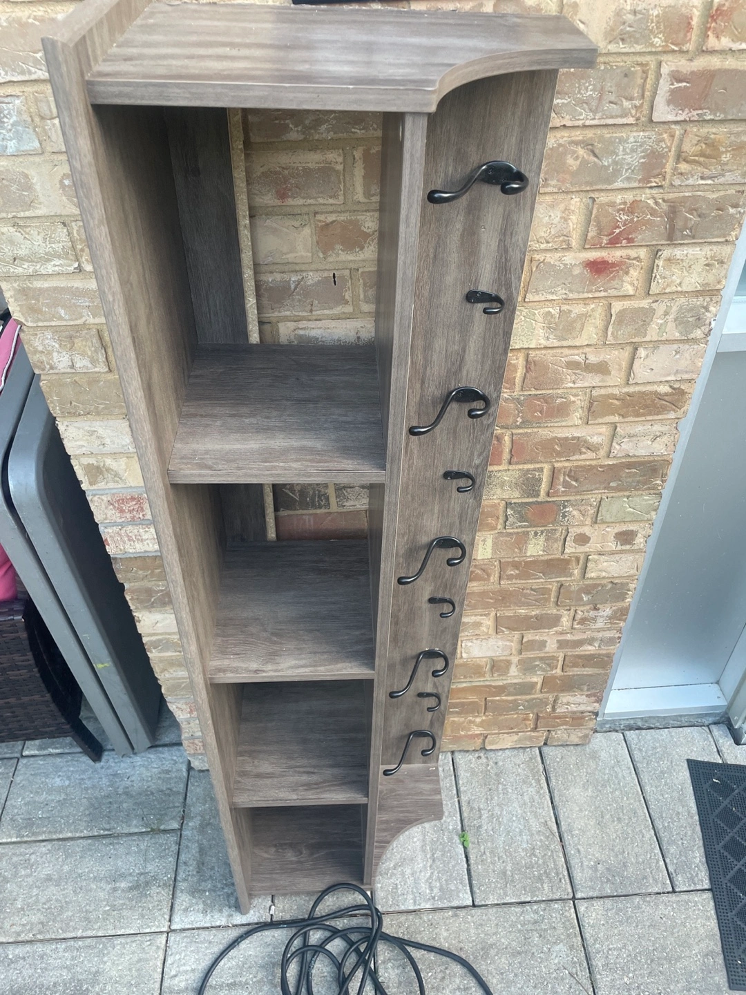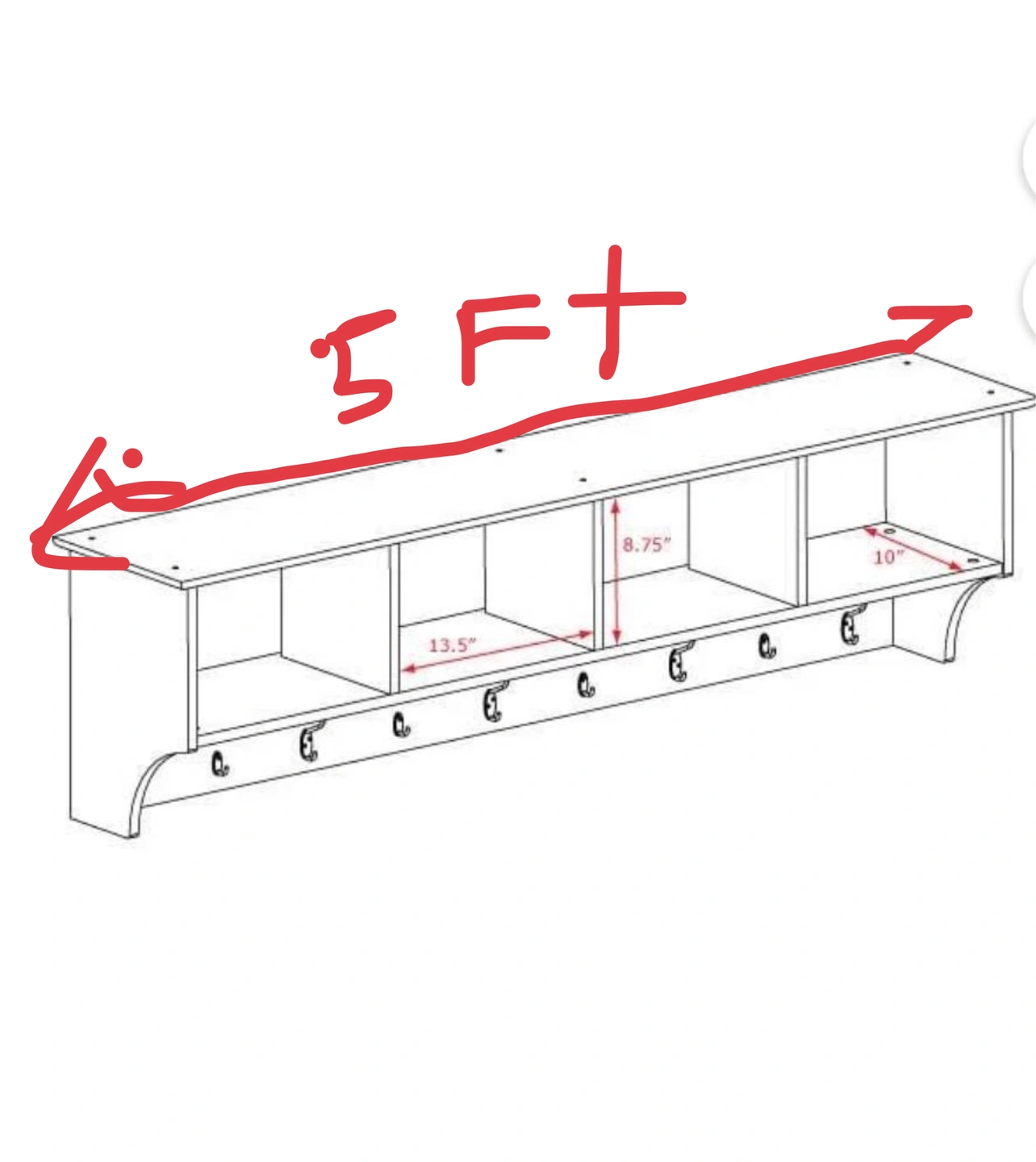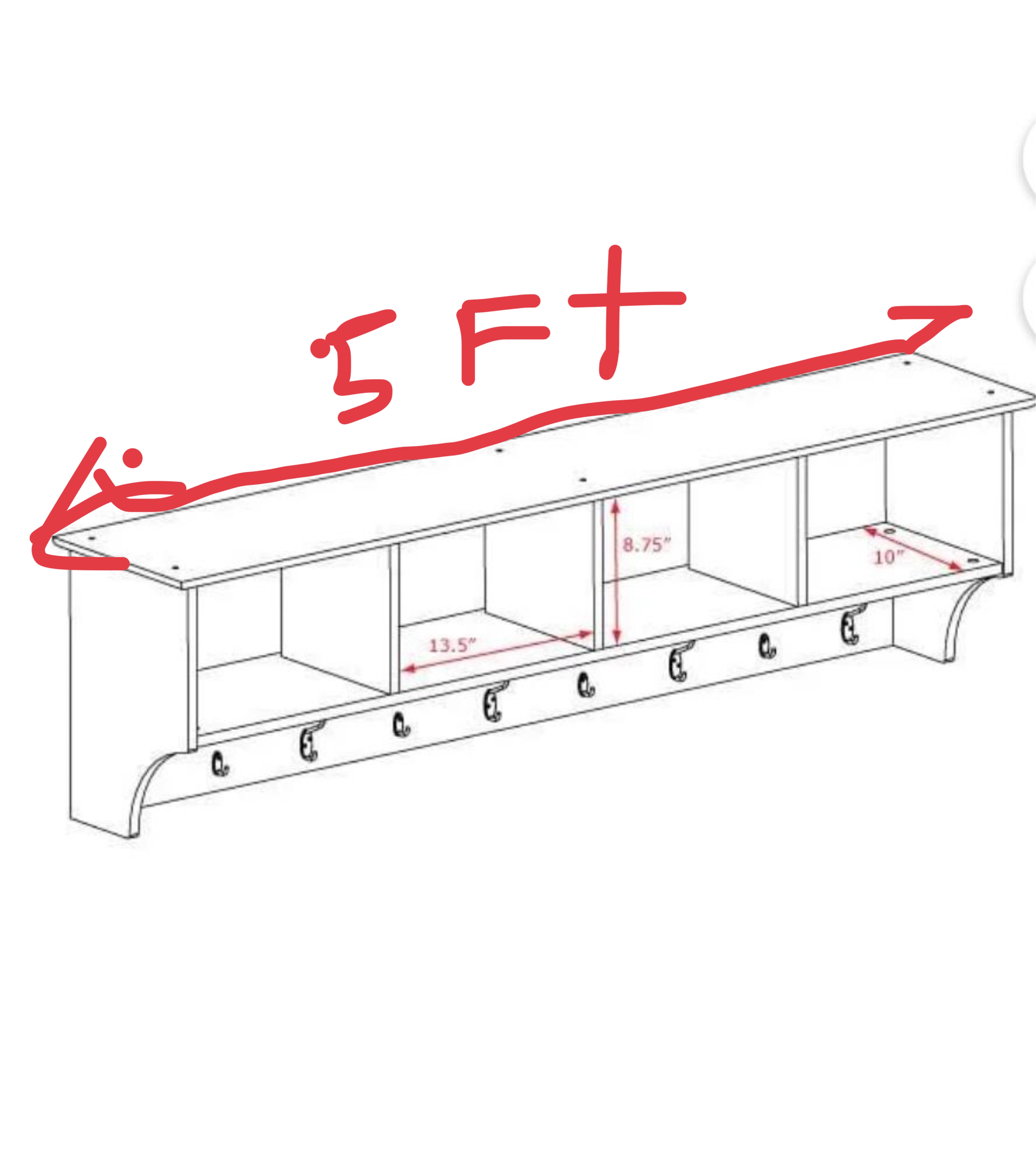 This wall-mounted entryway shelf is perfect for keeping your entryway organized! It features a shelf with cubbies for storage and coat hooks for hanging jackets and bags. It measures 5 feet long and 10 inches deep. Great for any home!