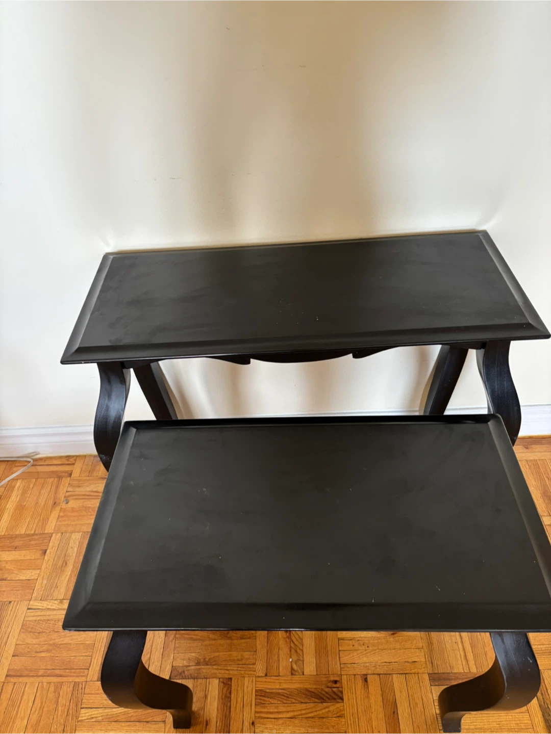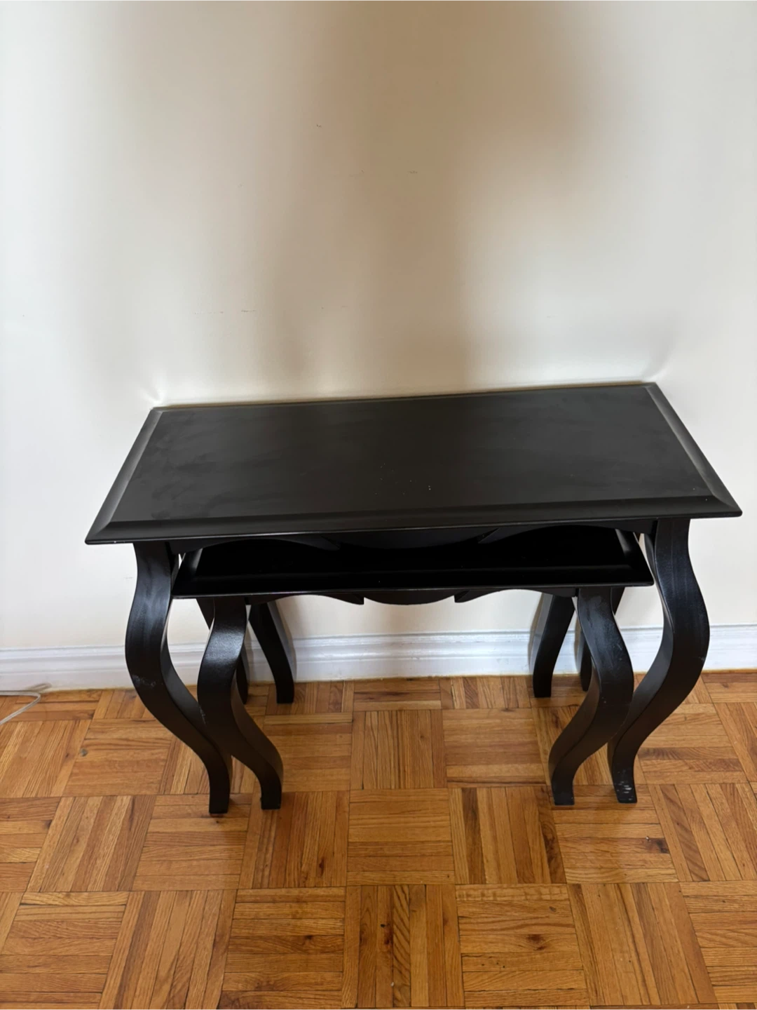 Selling a set of two black nesting tables! They are in great condition and perfect for adding a touch of elegance to any room. These tables are versatile and can be used in a variety of ways, such as side tables, end tables, or even as decorative pieces
